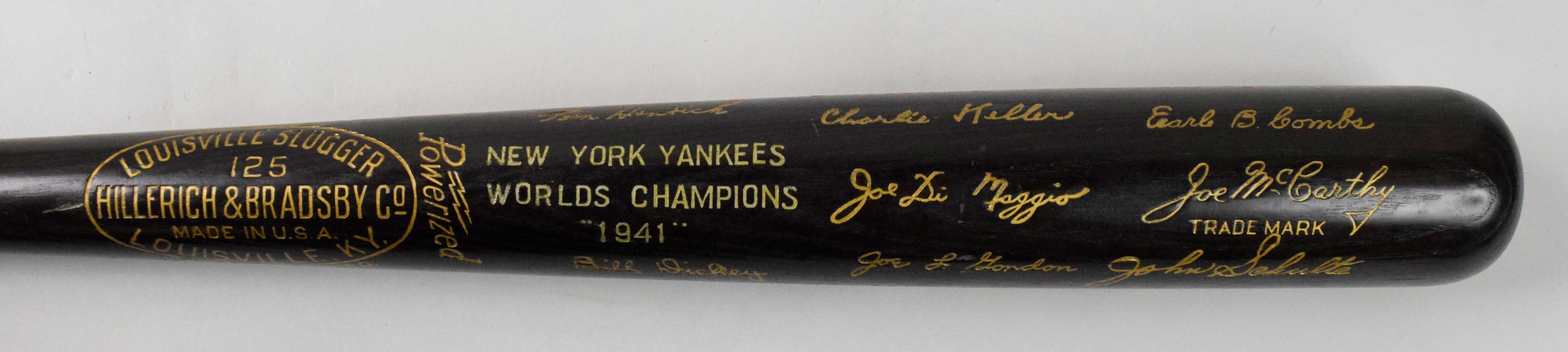 Description:High grade 1941 New York Yankees World Series Champions black bat (NM) Louisville Slugger commemorative bat has gilt impressed facsimile signatures or names and titling. High grade example and a relatively tough bat with this being one of few we have offered and surely it is the best with regard to condition: NM ($400-$600)