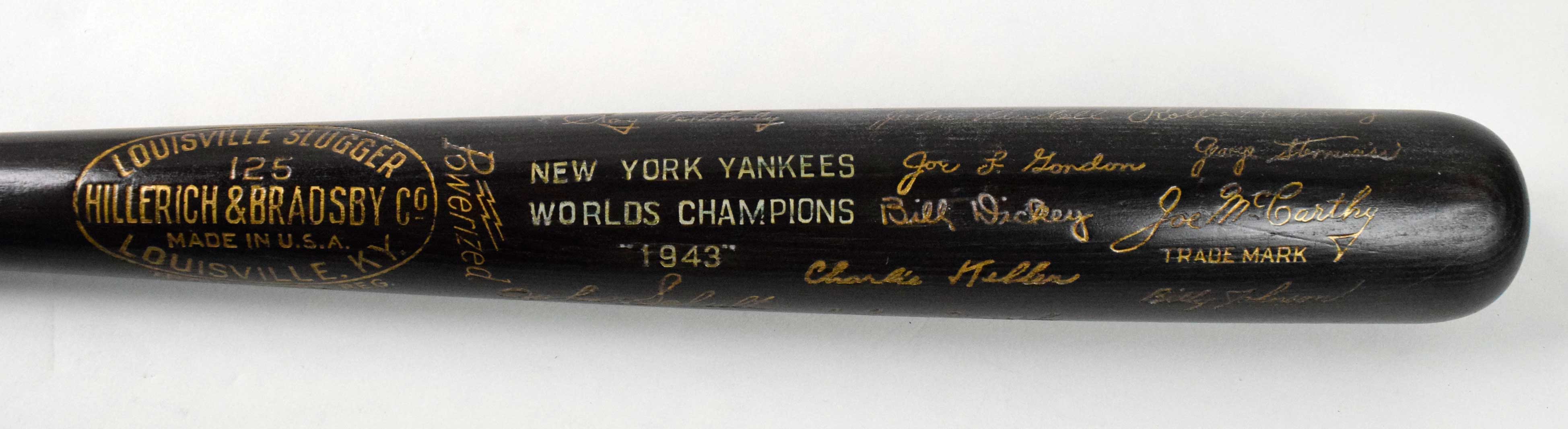 Description:High grade 1943 New York Yankees World Series Champions black bat (NM) Louisville Slugger commemorative bat has gilt impressed facsimile signatures or names and titling. High grade example and a relatively tough bat with this being one of few we have offered and surely it is the best with regard to condition: NM ($400-$600)