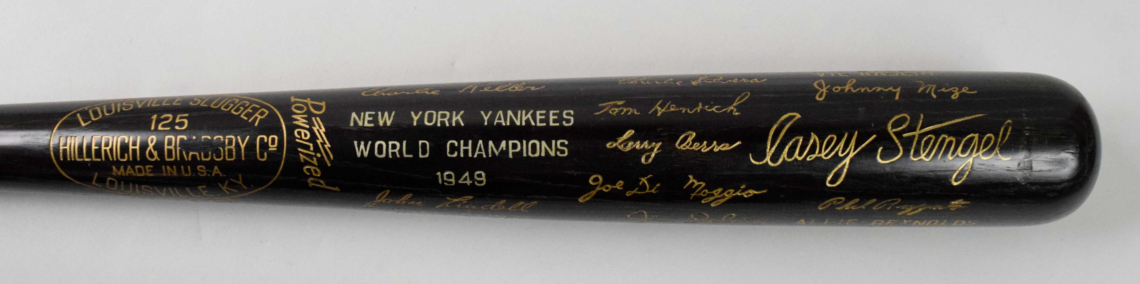 Description:High grade 1949 New York Yankees World Series Champions black bat (EX/MT-NM) Louisville Slugger commemorative bat has gilt impressed facsimile signatures or names and titling. High grade example and a relatively tough bat with this being one of few we have offered and surely it is the best with regard to condition. There is a small indentation on the barrel end which hardly detracts from display value: EX/MT-NM ($400-$600)