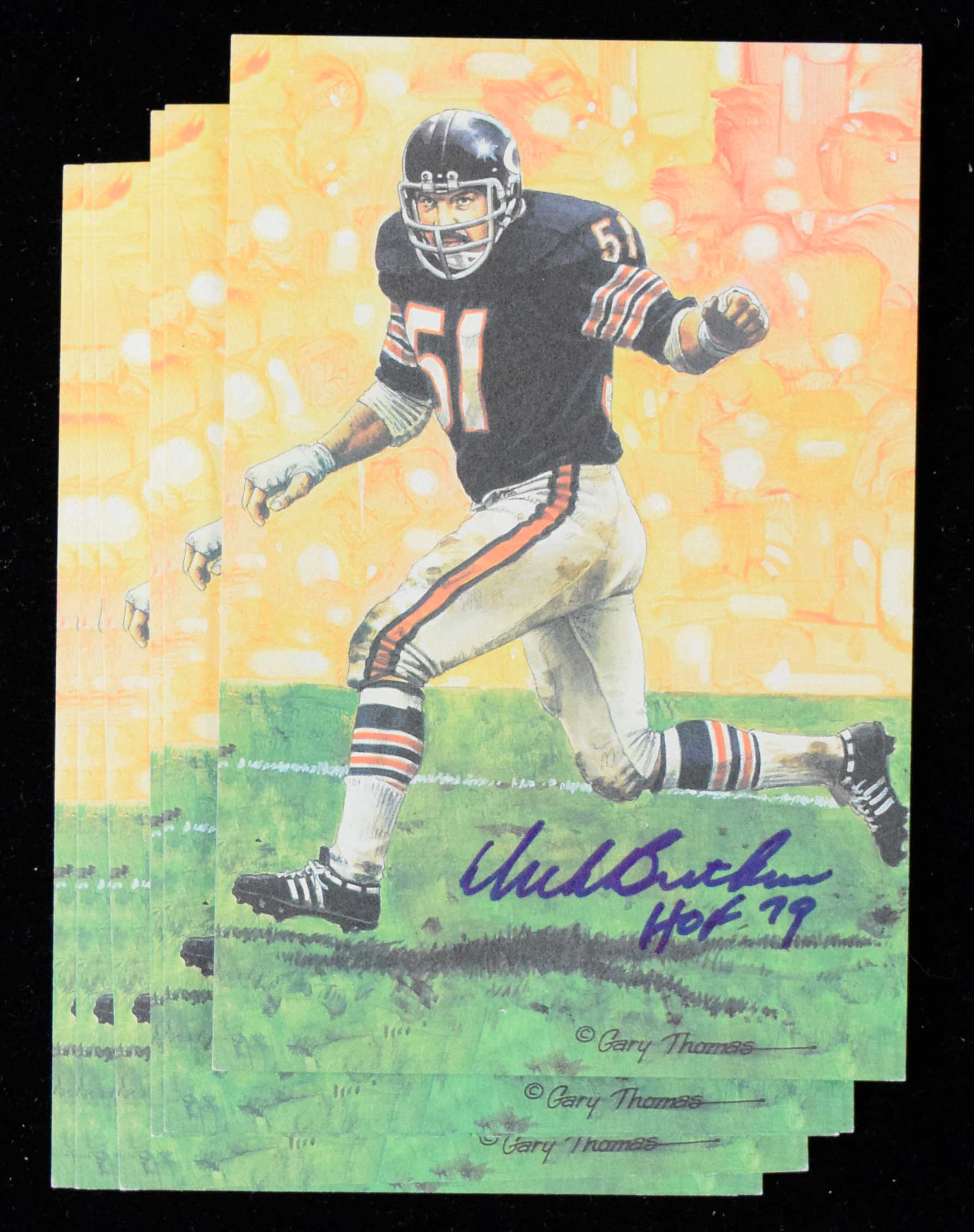 Lot of (6) Dick Butkus autographed Goal Line Art postcards (NM) Each signed in marker rating 9 to 9/10 out of 10: NM