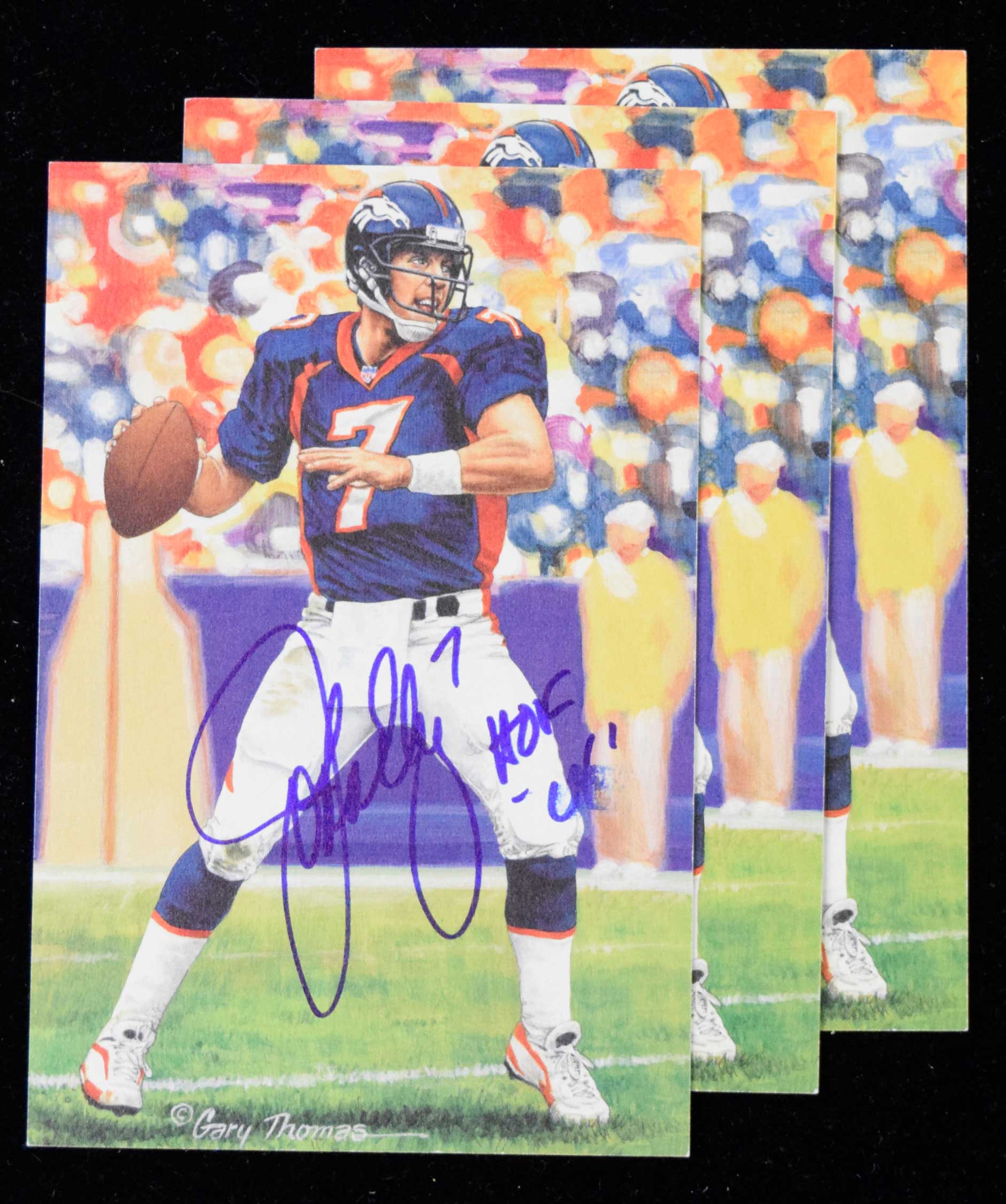 Description:Lot of (3) John Elway autographed Goal Line Art postcards (EX-NM) Each signed in marker with (2) rating 9 to 9/10 out of 10 and (1) lesser with a smudge. Each has Elway hologram on back: EX-NM