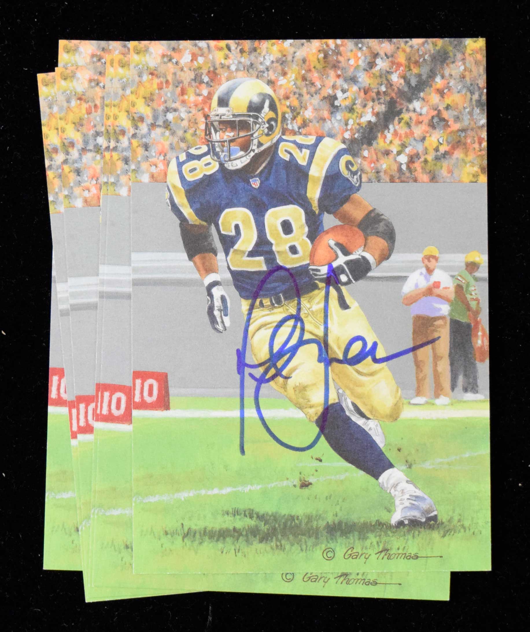 Lot of (6) Marshall Faulk autographed Goal Line Art postcards (NM) Each signed in marker rating 9 to 9/10 out of 10: NM