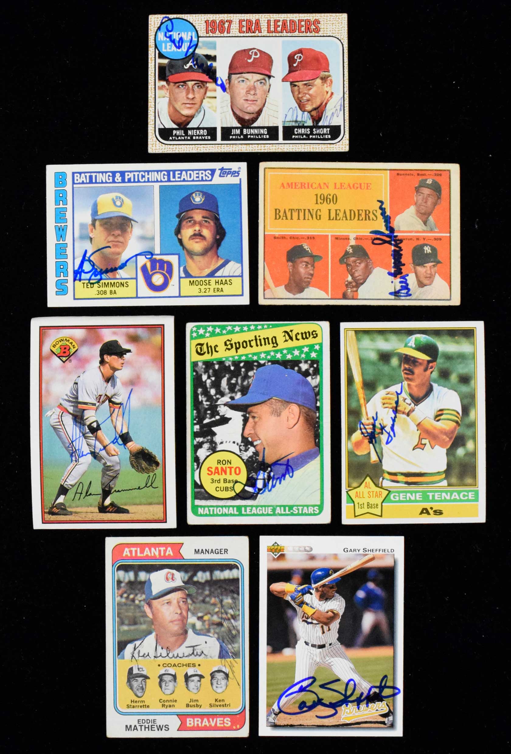Description:Lot of approx. (750) autographed baseball cards (VG-EX/MT) Full (800) count box of autographed cards with the majority dating to the 1980s but there are some 1970s and some earlier. Some players are represented by (1) card, others by many. Signatures rate generally rate 7 to 9 out of 10 with some lesser and there are varying degrees of handling wear throughout. PLEASE NOTE: cards have been screened for authenticity however there are surely a few secreterial or otherwise non-authentic pieces mixed in. Signers include Alan Trammell, Bobby Shantz, Chuck Tanner, Frank Tanana, Gene Tenace, Tony Taylor, Sammy Stewart, Lee Smith, Moose Skowron, Bob Stanley, Roy Sievers, Ron Swoboda, Haywood Sullivan, Phil Niekro/Chris Short (dual signed), Gary Sheffield, Eddie Mathews, Dick Schofield, Kin Singleton, Mike Scott, Mike Scioscia, Andy Van Slyke, Bob Skinner, Ted Simmons, Ron Santo, and others: VG-EX/MT