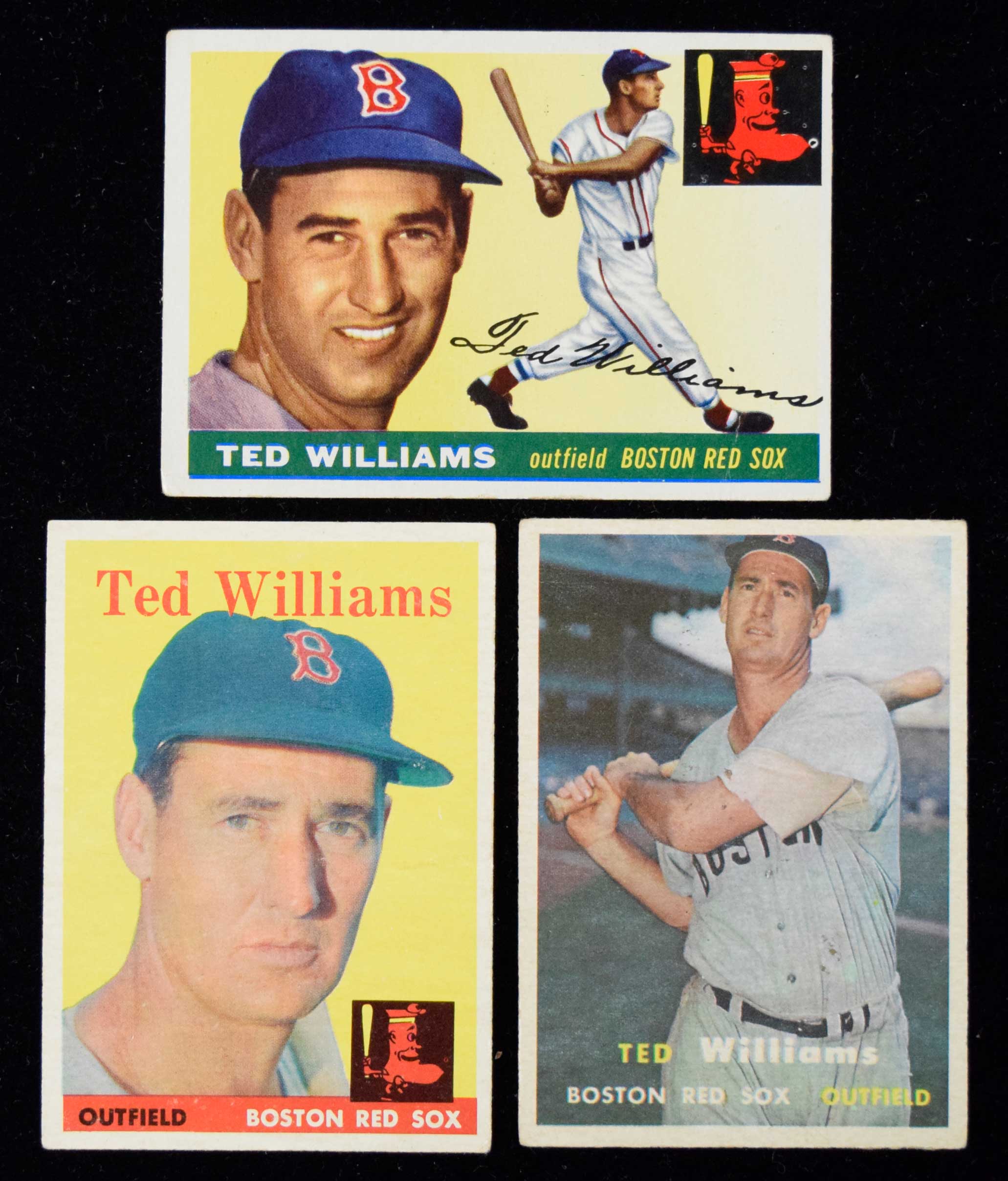 Lot of (3) 1955-1958 Topps Ted Williams cards (GD-VG) Includes 1955 Topps #2 (GD/VG), 1957 Topps #1 (GD), and 1958 Topps #1 (VG): GD-VG