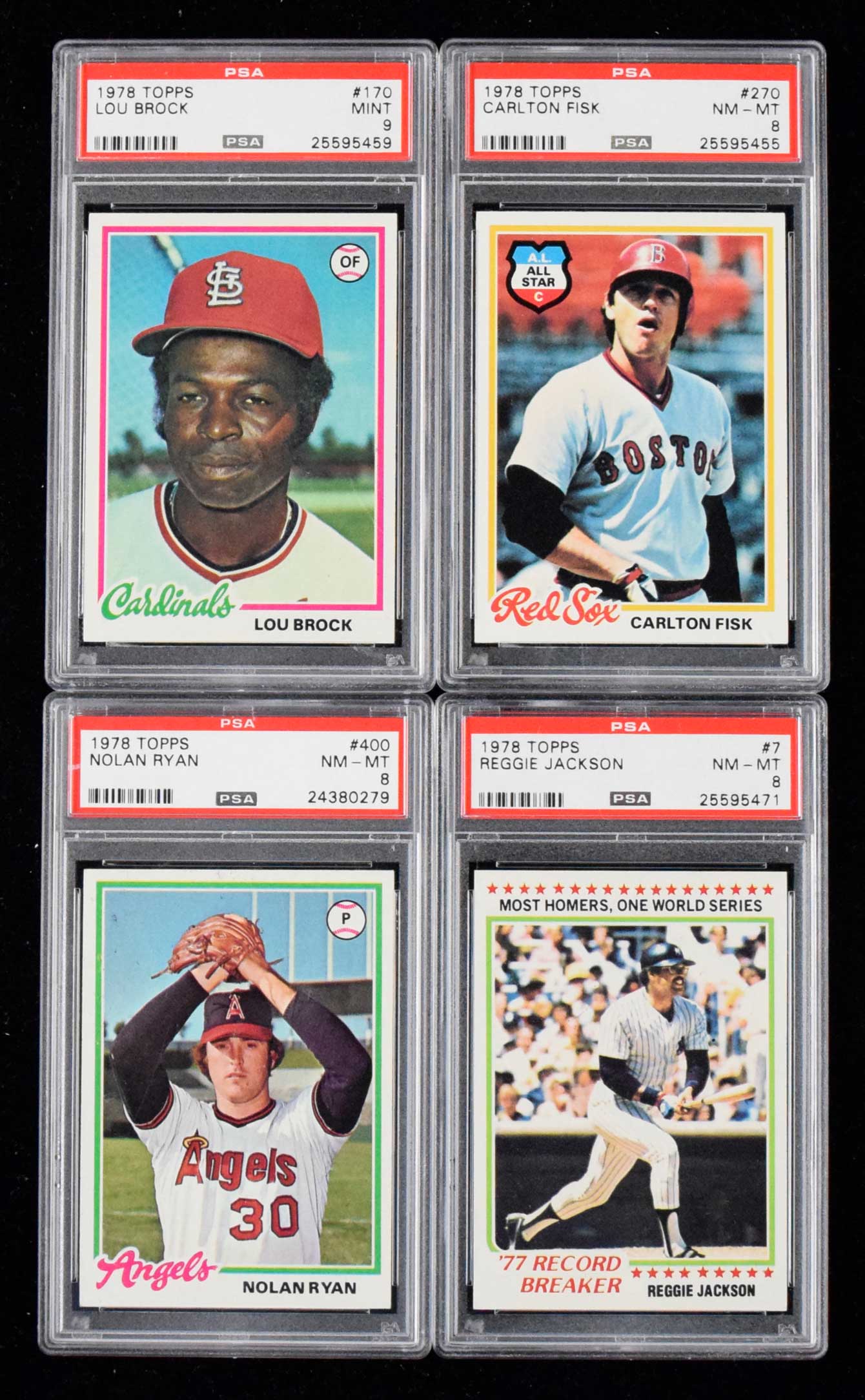 Description:High grade 1978 Topps Baseball near complete set (725 of 726 cards) with (27) graded NM or better (Avg. NM) Very strong set in NM overall condition includes (26) cards which are PSA graded NM or better and (1) SGC. We state that the set is near complete as the Eddie Murray is included but appears to have been trimmed. Includes SGC 88 NM/MT #6 Ryan; PSA NM 7 #3 McCovey, 34 McCovey, 100 Brett, 120 Carter, and 173 Yount; PSA NM+ 7.5 #450 Seaver; PSA NM-MT 8 #2, 7 Jackson, 10 Niekro, 72 Dawson, 140 Fingers, 189 Lasorda, 270 Fisk, 282, 325, 400 Ryan, 401 Anderson, 530 Winfield, and 720 Jenkins; PSA NM-MT 8 with qualifier #15 Perez and 300 Morgan; and PSA Mint 9 #109 Torre, 131 Blyleven, 170 Brock, 211 Weaver, and 310 Sutton: Avg. NM