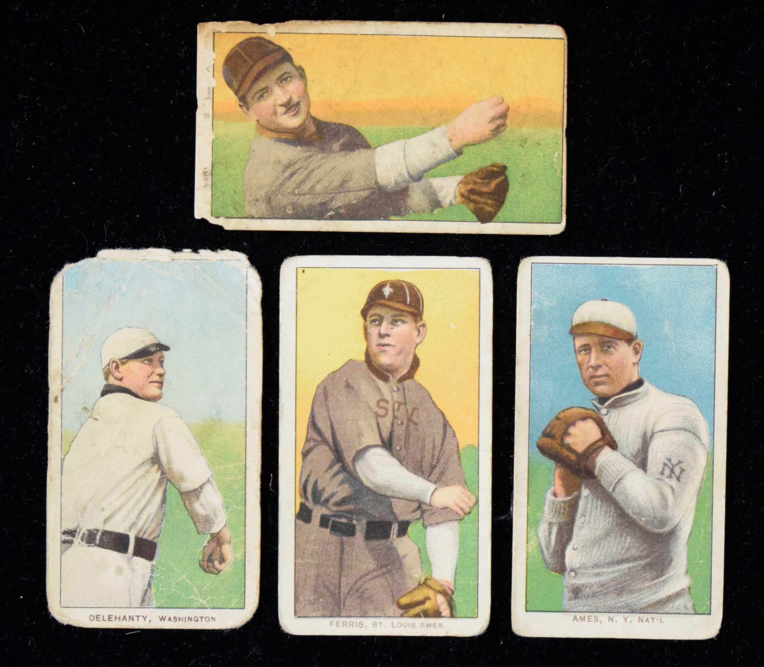Description:Lot of (4) 1909-11 Hindu back cards (PR-FR) All cards fall at lowest end of grading scale with varying degrees/types of wear throughout. Note that some may not qualify for a number grade if submitted to a third party. Includes Jim Delahanty, Red Ames (hands at chest), Jack Powell (very heavy wear, significant flaws), and Hobe Ferris: PR-FR