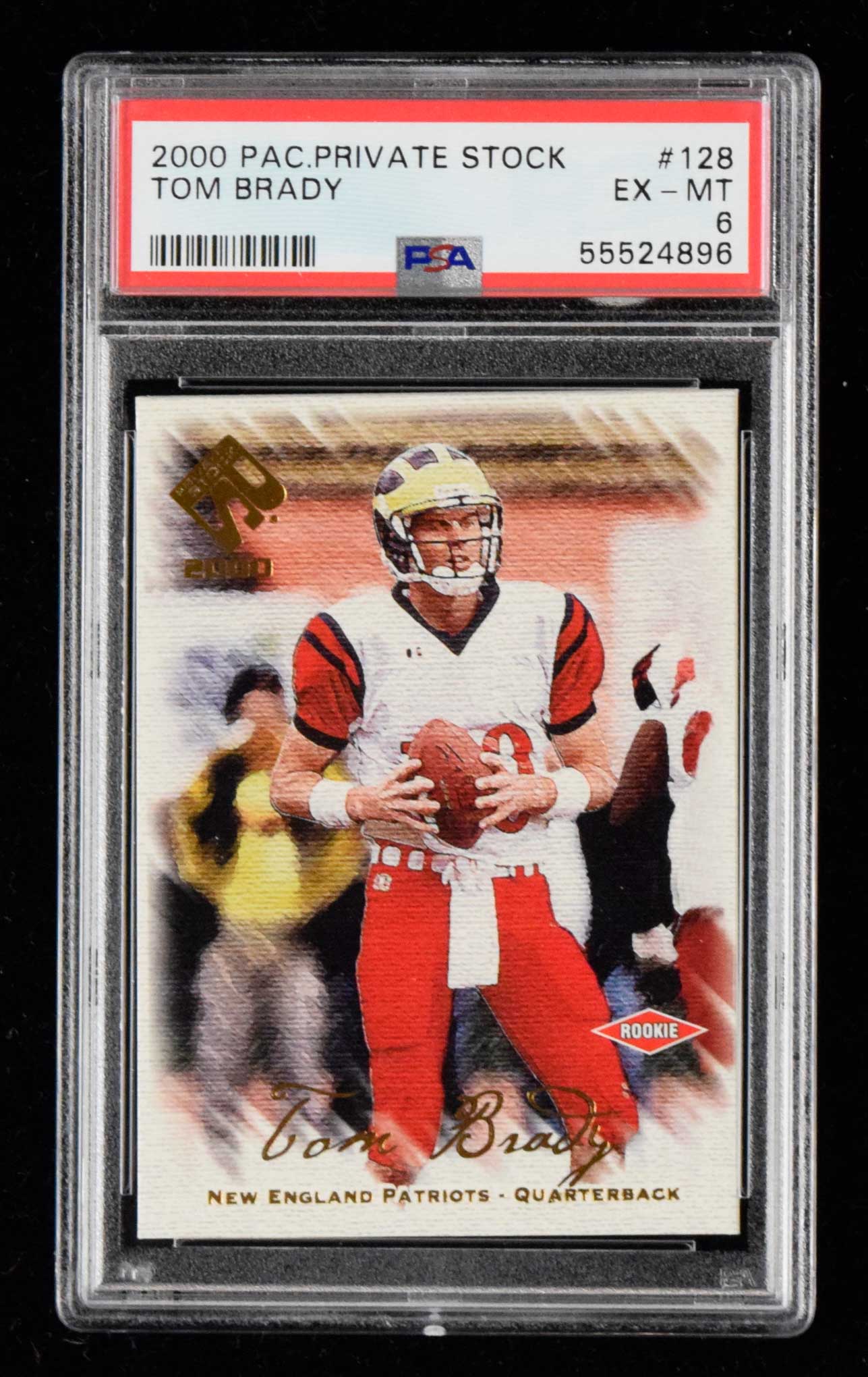 Description:2000 Pacific Private Stock #128 Tom Brady Rookie ("271/278") (PSA EX-MT 6) Limited edition Rookie card in "pack fresh" condition with the slightest hint of edge wear which is likely the result of the manufacturing process: PSA EX-MT 6 ($500-$1,000)