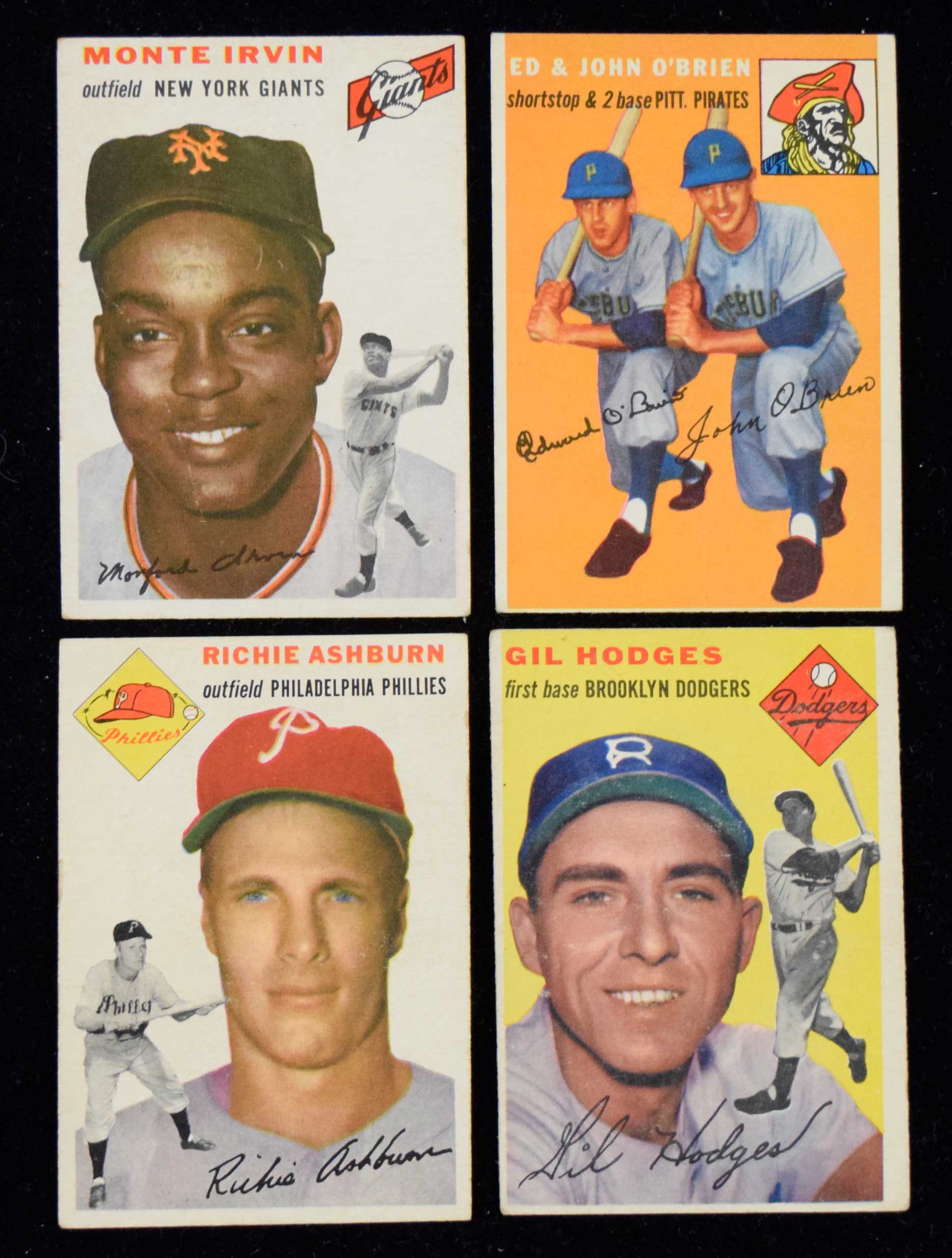 Description:Lot of (40) 1954 Topps Baseball cards (Avg. VG) Average VG condition with GD-VG/EX general range. Mostly commons with a few better names including Gil Hodges, Richie Ashburn, Monte Irvin, (2) Bill Skowron, Clem Labine, Andy Pafko, O'Brien brothers, Ed Lopat, and Luke Easter: Avg. VG