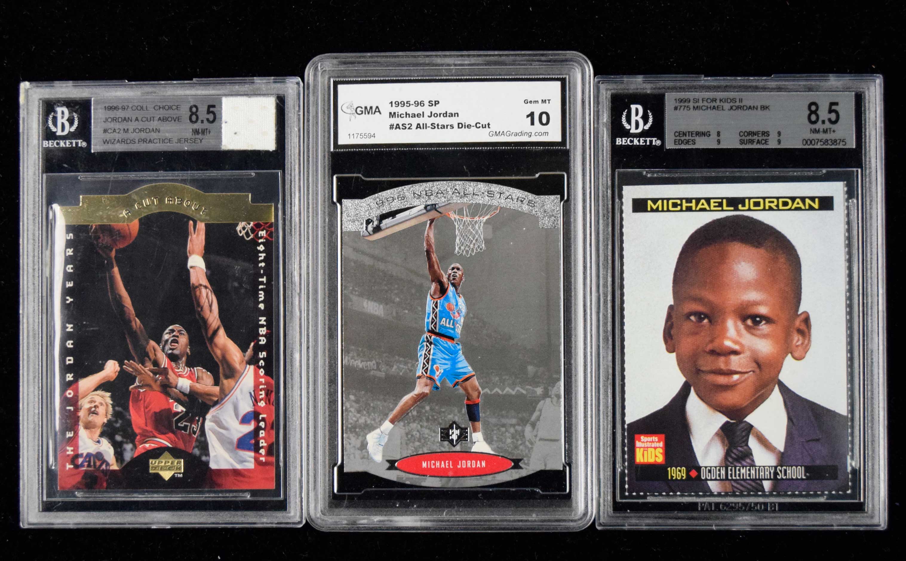 Description:Lot of (11) Michael Jordan basketball cards (EX/MT-NM) Includes (2) 1995 Upper Deck Michael Jordan First Championship limited edition cards; 1995-96 SP #AS2 All-Stars die-cut (in GMA holder); 1996-97 UD Cut Above #CA2 Jordan die-cut card in BGS 8.5 NM-MT+ holder which has a small jersey swatch inside; 1998 Upper Deck Gatorade Michael Jordan 3000 Points (1987); 1999 SI For Kids II #775 Micheal Jordan (BGS 8.5 NM-MT+); and (5) additional Jordan cards: EX/MT-NM