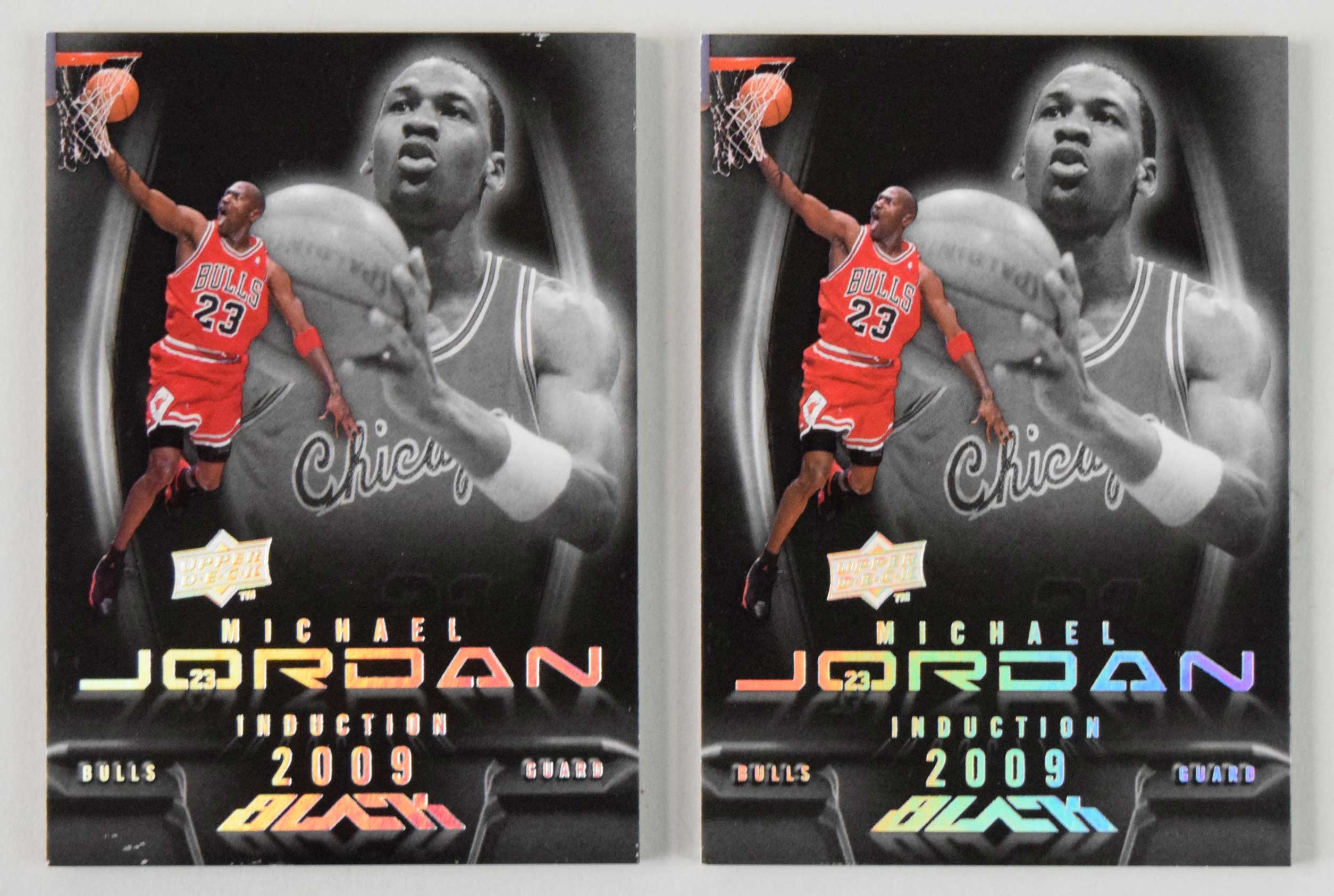 Description:Lot of (2) 2009 Upper Deck UD Black #MJ-HOF Michael Jordan Induction cards (EX/MT-NM) Pair of cards with each showing the slighest hint of light wear: EX/MT-NM