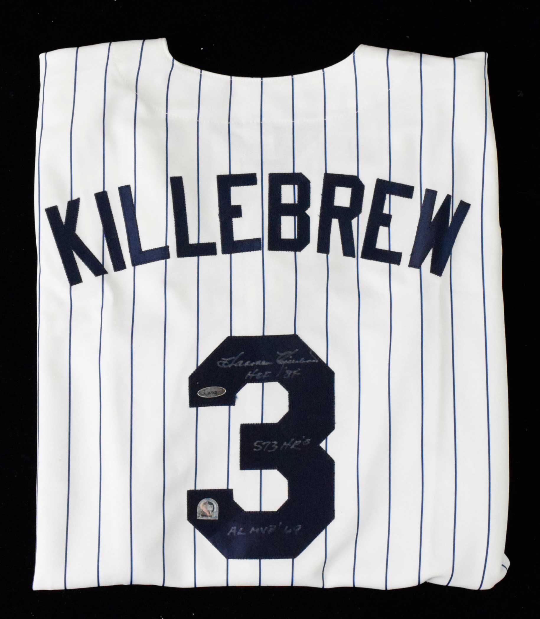 Description:Harmon Killebrew autographed stat inscribed Minnesota Twins jersey (EX-NM) Twins jersey by Russell Athletic (size 48) has been signed on the back number in marker rating 6/7-7 out of 10 and inscribed HOF, 573 HR, and AL MVP 69. MLB and Tri-Star Authentication holograms affixed: EX-NM