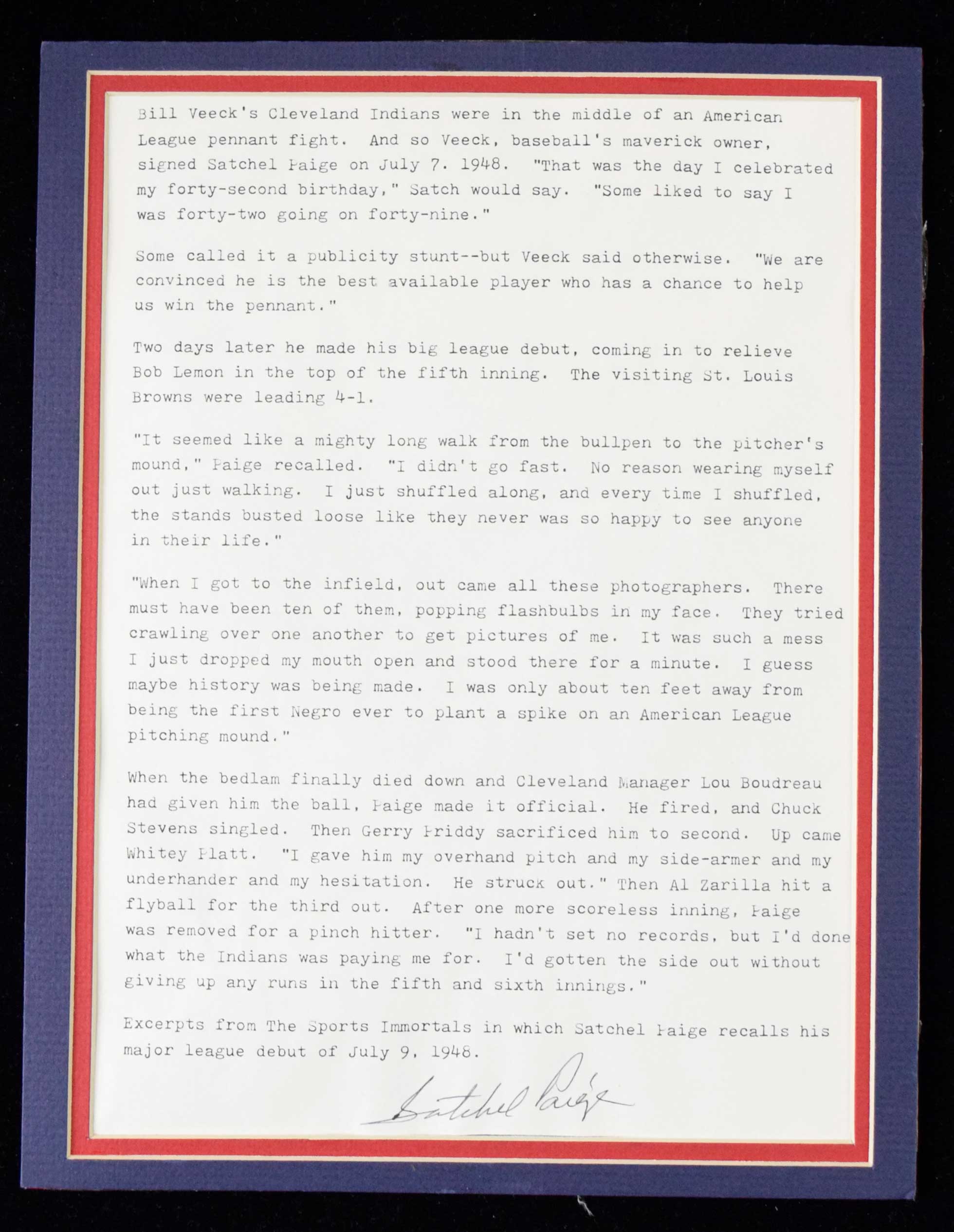 Description:Satchel Paige autographed "Big league debut" display piece (EX-NM) Matted display (8.75"x11.25") holds a typewritten transcript which describes Satchel Paige's debut in the Major Leagues. It has been signed along the lower edge in ink rating 8/9 out of 10. Touch of light wear: EX-NM