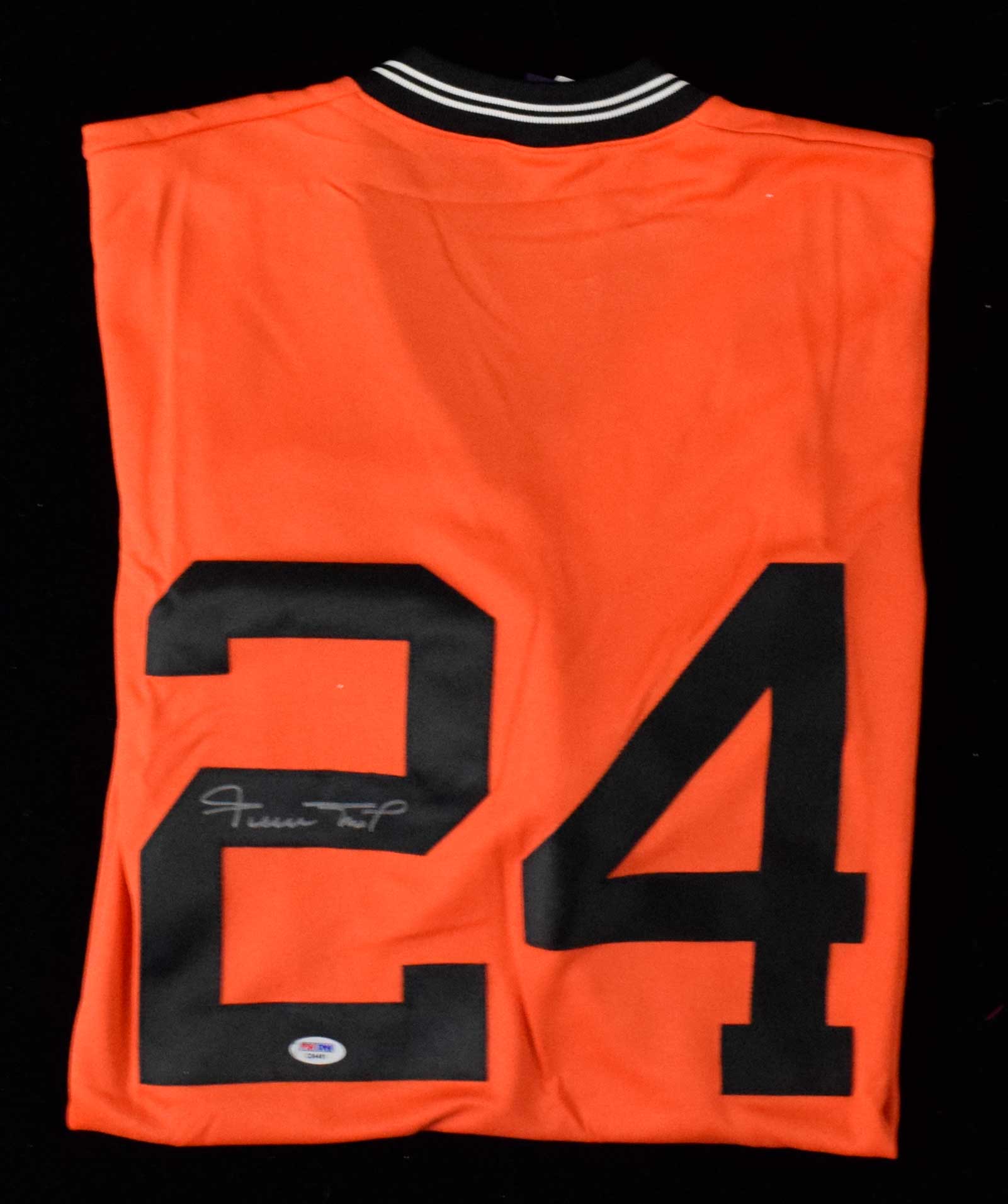 Description:Willie Mays autographed San Francisco Giants shirt (PSA/DNA) (NM) Orange shirt (Majestic, size L) has the Giants logo screened on front and number "24" on back. Signed on the back number in marker rating 8 out of 10 and includes COA from PSA/DNA: NM