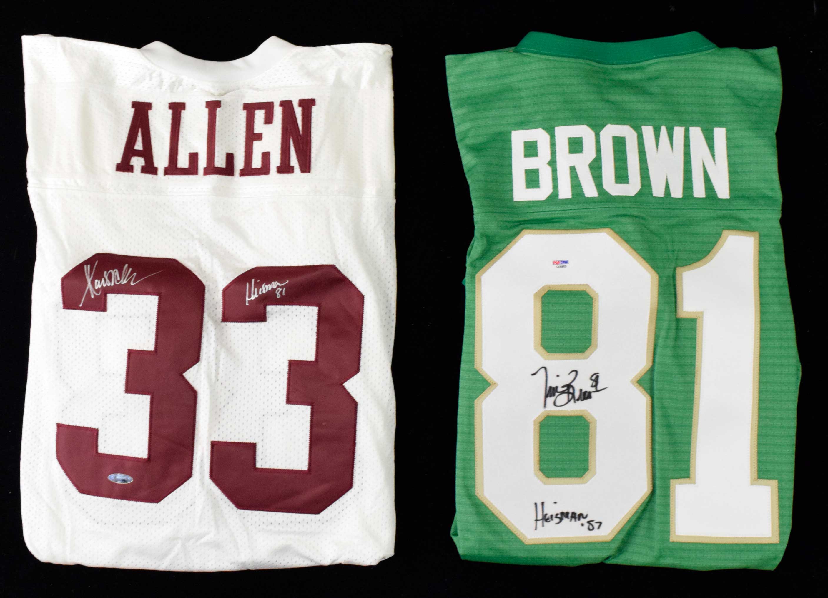 Description:Marcus Allen and Tim Brown autographed "Heisman" inscribed jerseys (NM) Includes white mesh jersey by Russell Athletic (size 64) which has been signed by Allen in silver marker rating 8/9 out of 10. Tri-Star Authentication hologram affixed; green jersey by Teamwork Athletic Apparel (size XL) which has been signed by Brown in black marker rating 7/8 out of 10. Includes COA from PSA/DNA: NM