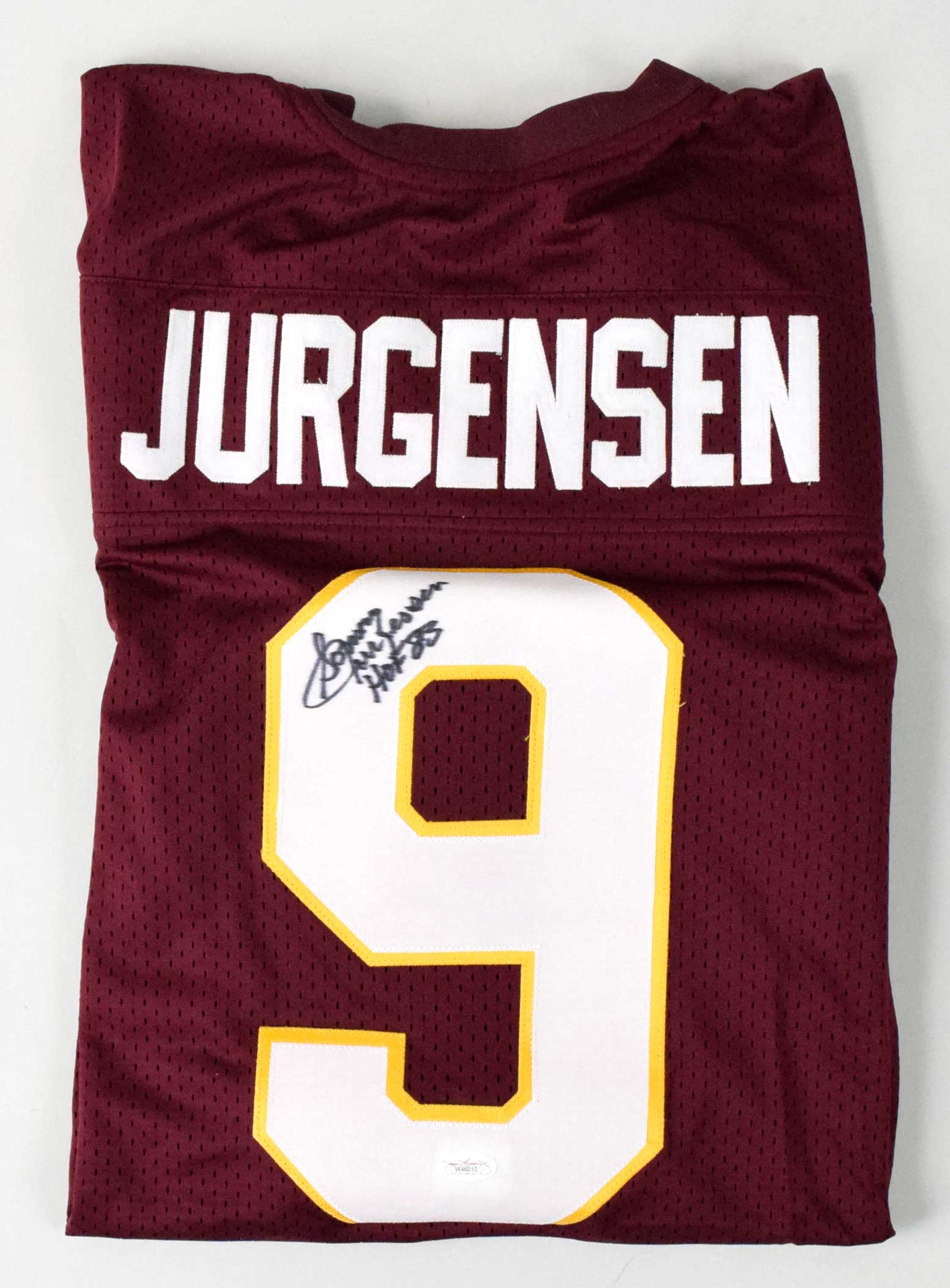 Description:Sonny Jurgensen autographed jersey (JSA) (EX/MT-NM) Mesh jersey has been signed on the back number in marker rating 7/8 out of 10. Includes COA from JSA: EX/MT-NM