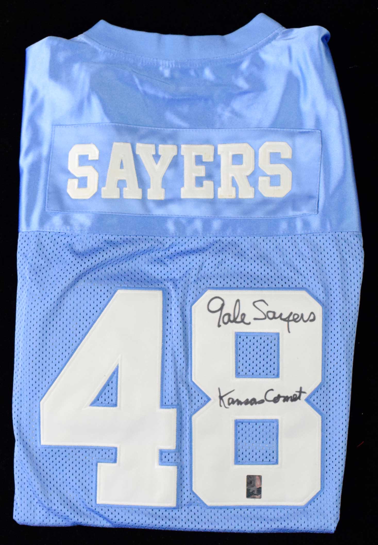 Description:Gale Sayers autographed jersey with "Kansas Comet" inscription (EX/MT-NM) Mesh jersey by True School Authentics (size 54) has been signed and inscribed on the back number in marker rating 7/8-8 out of 10. Sayers authentication hologram affixed: EX/MT-NM