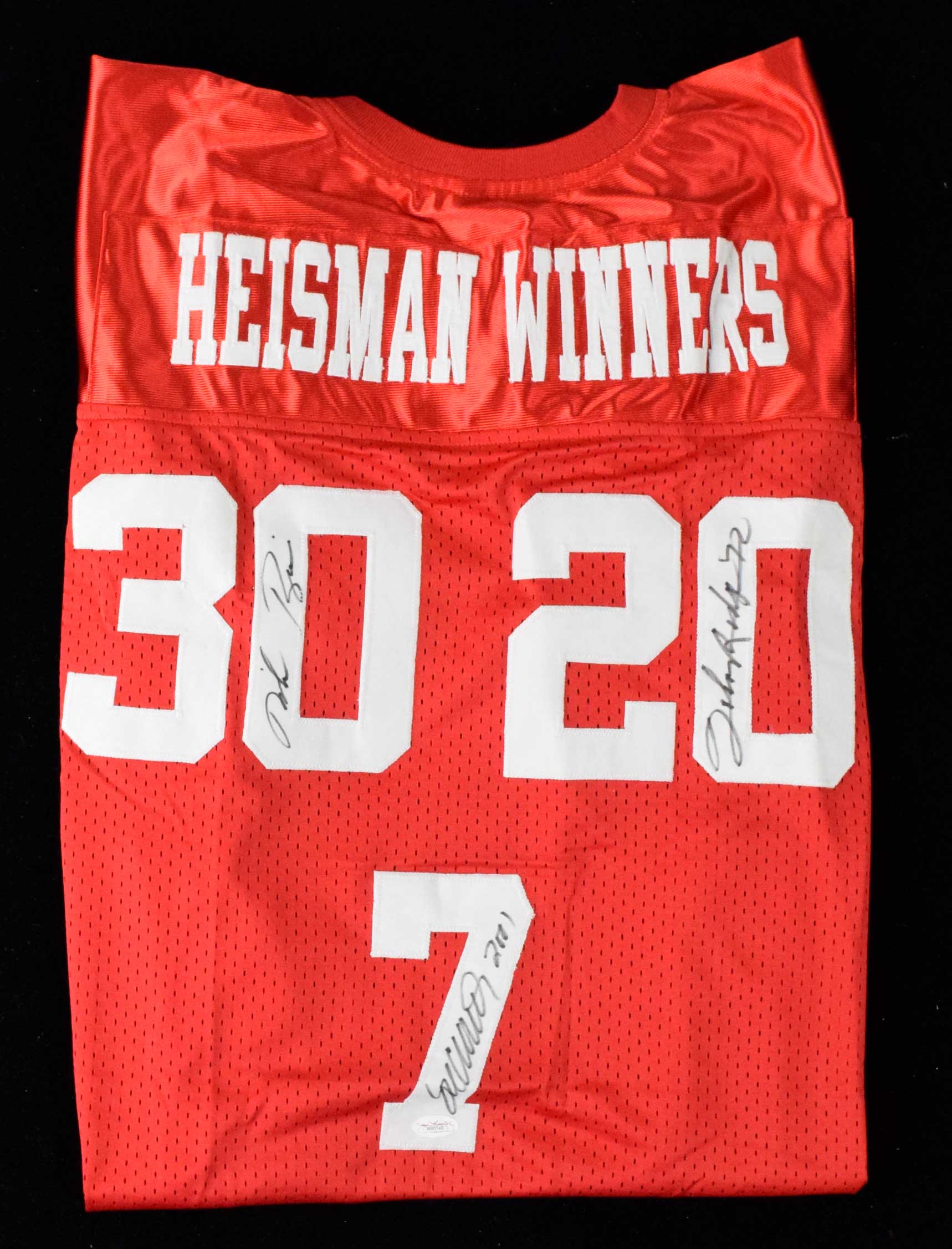 Description:Johnny Rodgers, Tim Crouch, and Mike Rozier autographed "Heisman Winners" jersey (JSA) (EX/MT-NM) Red mesh custom jersey has been signed by each on their respective number in marker rating 7/8-8 out of 10. JSA Authentication sticker affixed (W80145) however the COA is not included: EX/MT-NM