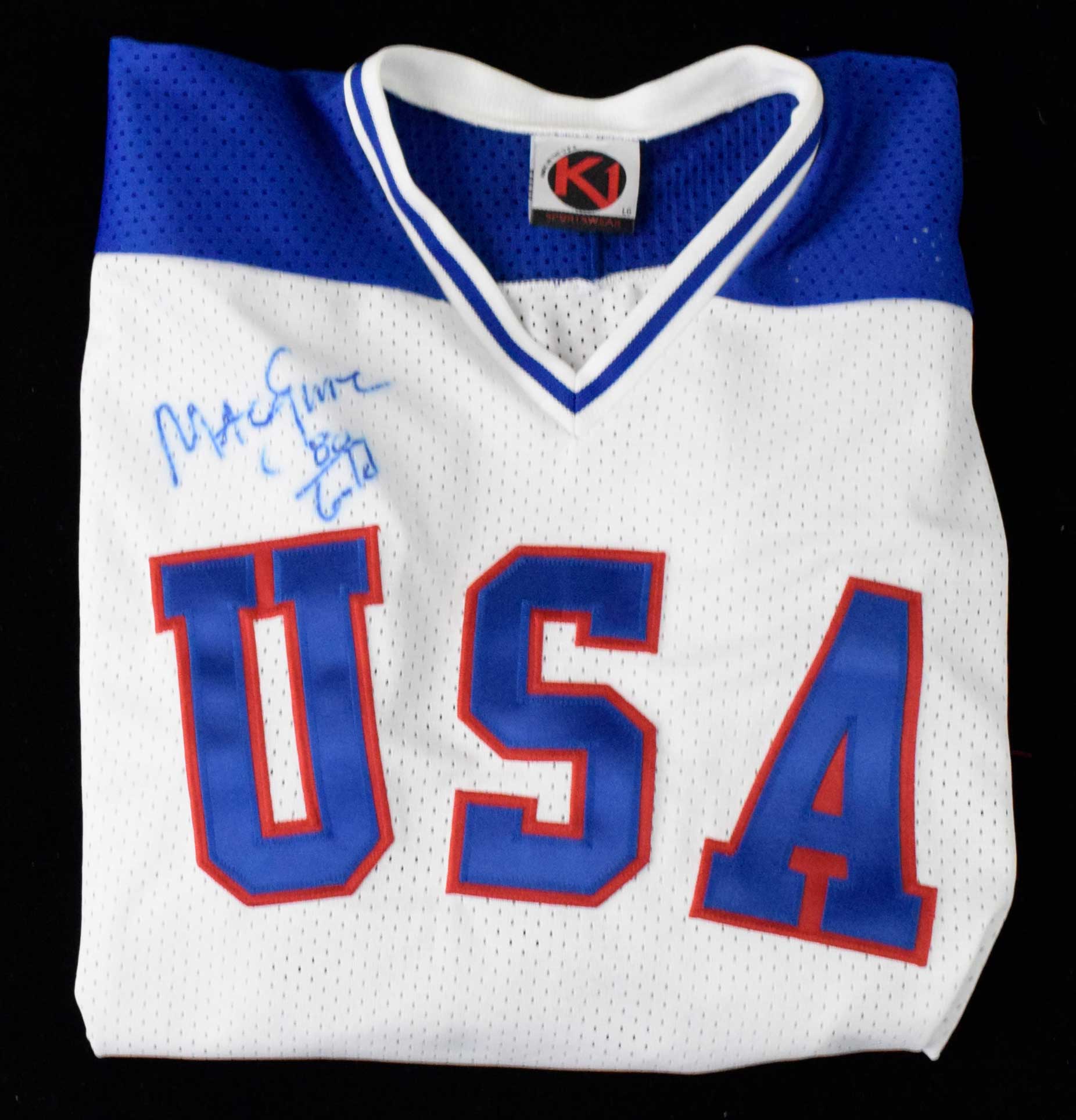 Description:Mike Eruzione autographed jersey (EX-NM) Red, white, and blue "USA" jersey has been signed and "80 Gold" inscribed in marker rating 7 out of 10. K1 Sportswear tag (size L) in the collar: EX-NM