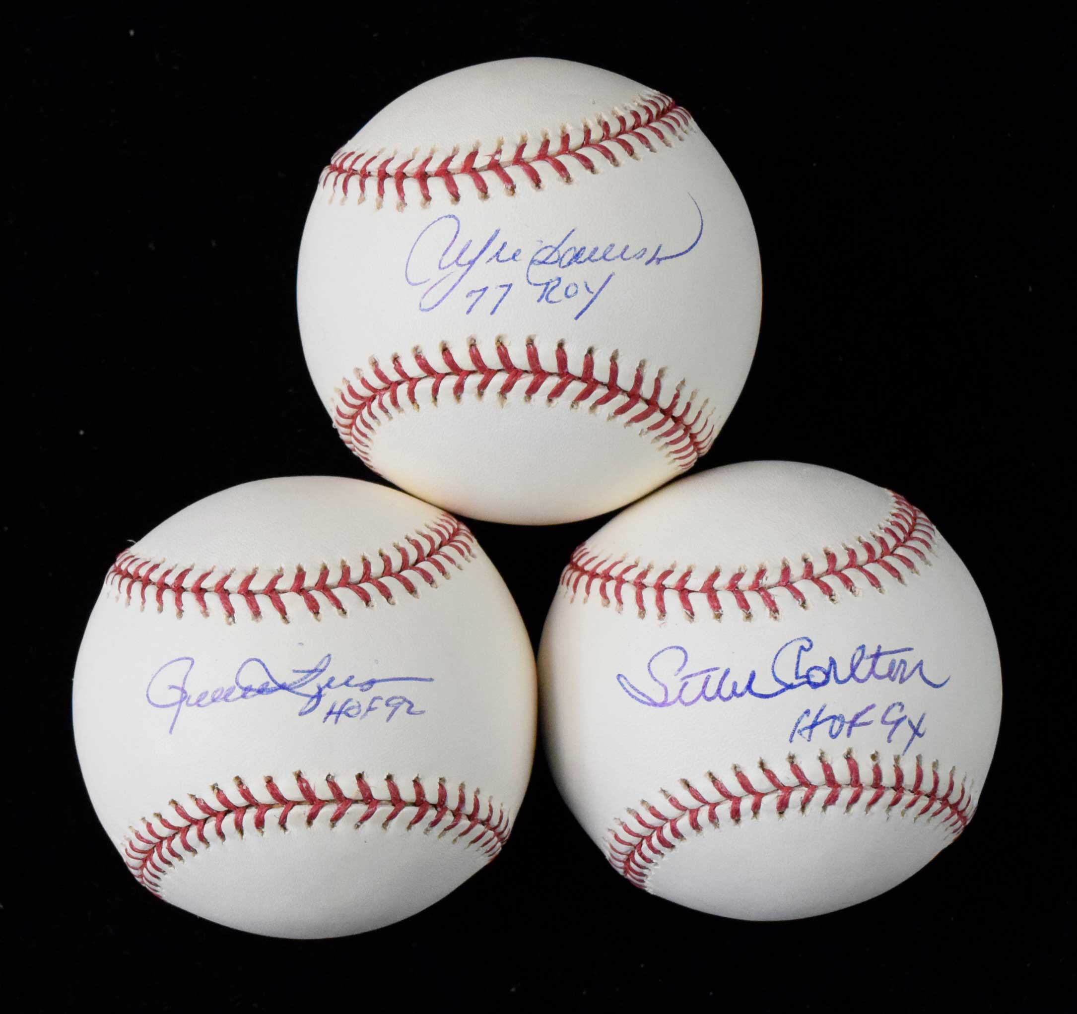 Description:Lot of (3) PSA graded "Mint+ 9.5" Hall of Famer single signed baseballs (PSA 9.5) Trio of Rawlings B.Selig OML balls have each been signed on the sweetspot by Steve Carlton (HOF inscription), Rollie Fingers (HOF), and Andre Dawson (77 ROY). Each includes full LOA from PSA/DNA with "Mint+ 9.5" grade noted and all are in the cube which the PSA label on underside (note: cube seals have been broken): PSA 9.5