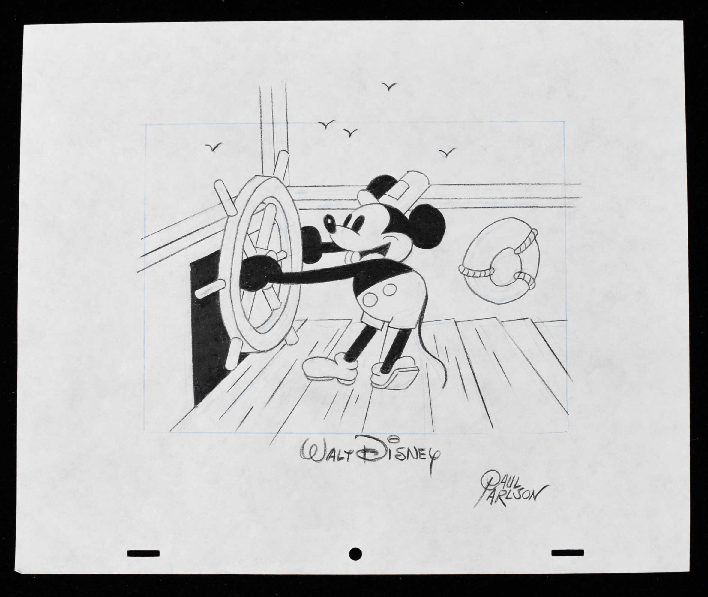 Description:Vintage Steamboat Willie animation drawing by Paul Carlson (NM) Original illustration done on paper (10.5"x12.75") is signed by artist Paul Carlson at lower right and he has recreated a Walt Disney signature along the lower edge. According to the "Toon Art" COA which is included the piece is an animator's sketch done as part of the early production process. Touch of light wear: NM