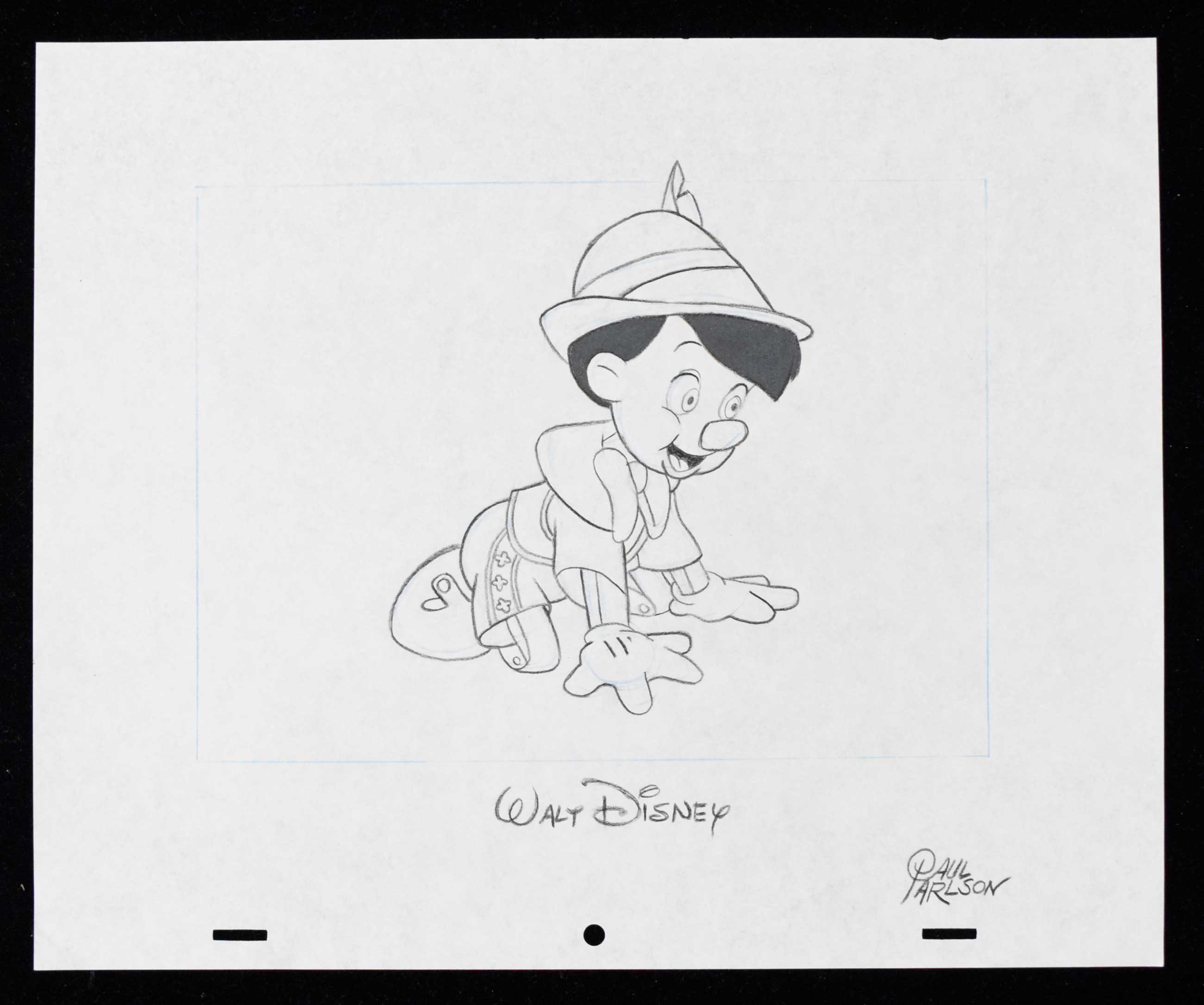 Description:Vintage Pinocchio animation drawing by Paul Carlson (NM) Original illustration done on paper (10.5"x12.75") is signed by artist Paul Carlson at lower right and he has recreated a Walt Disney signature along the lower edge. According to the "Toon Art" COA which is included the piece is an animator's sketch done as part of the early production process. Touch of light wear: NM