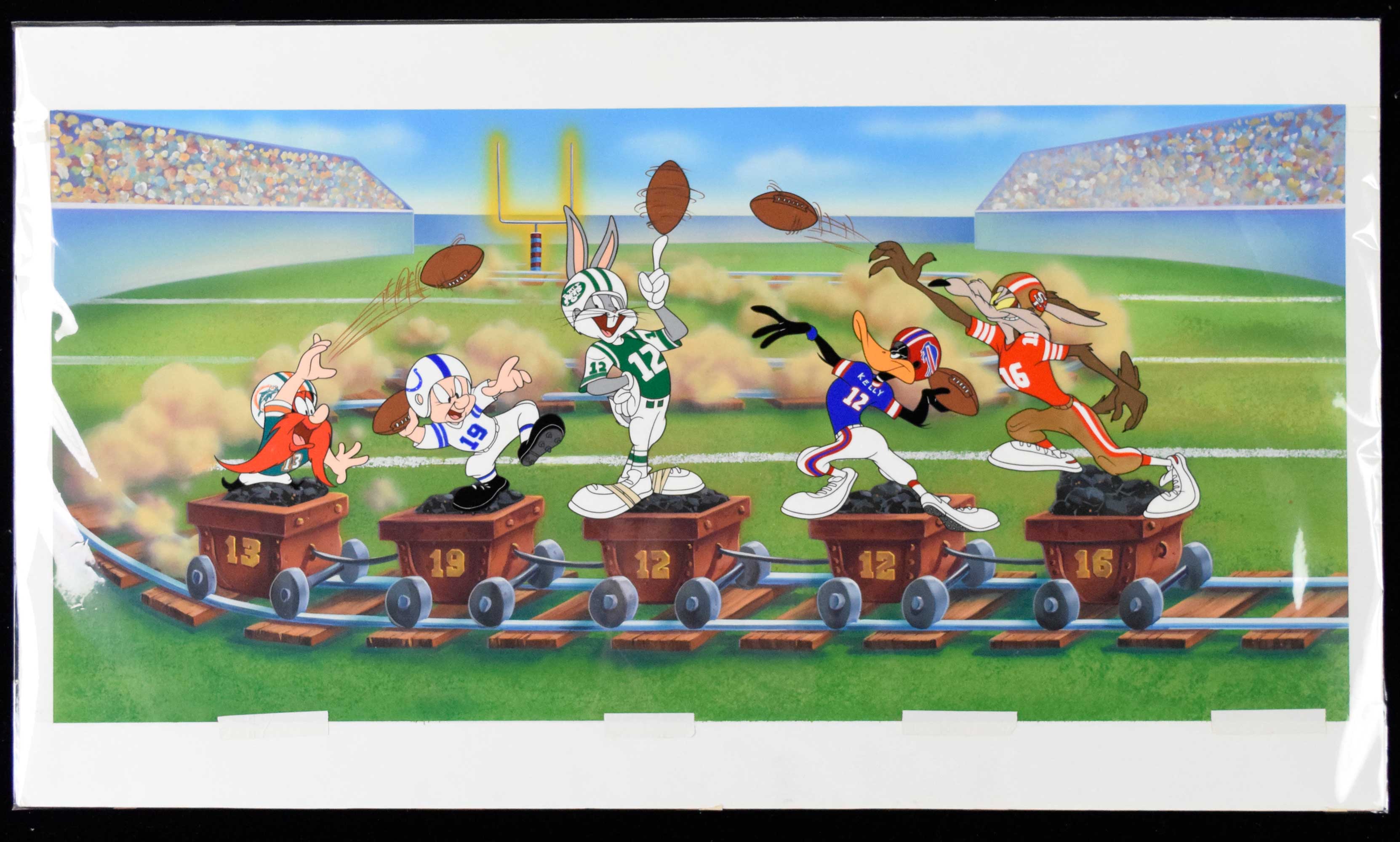 Description:Large format "Coal Mine to Goal Line" hand painted animation cel and "master background" (NM) Oversized piece (17.25"x30") is noted on the included COA as being a prototype and includes both a hand painted background (on heavy stock art board) with affixed animation cel on front. The characters are done in the uniforms of Johnny Unitas, Joe Namath, Dan Marino, Jim Kelly, and Joe Montana: NM