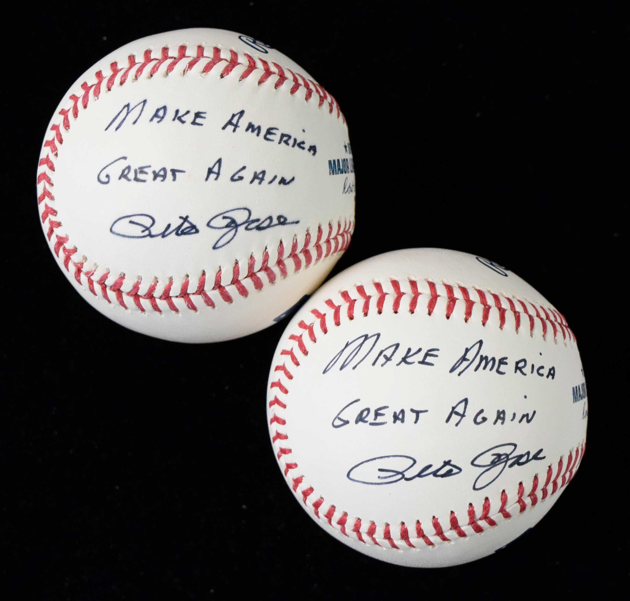 Description:Lot of (2) Pete Rose "Make America Great Again" autographed baseballs (NM) Rawlings B.Selig OML balls, each signed on the side panel rating 8 to 9 out of 10: NM