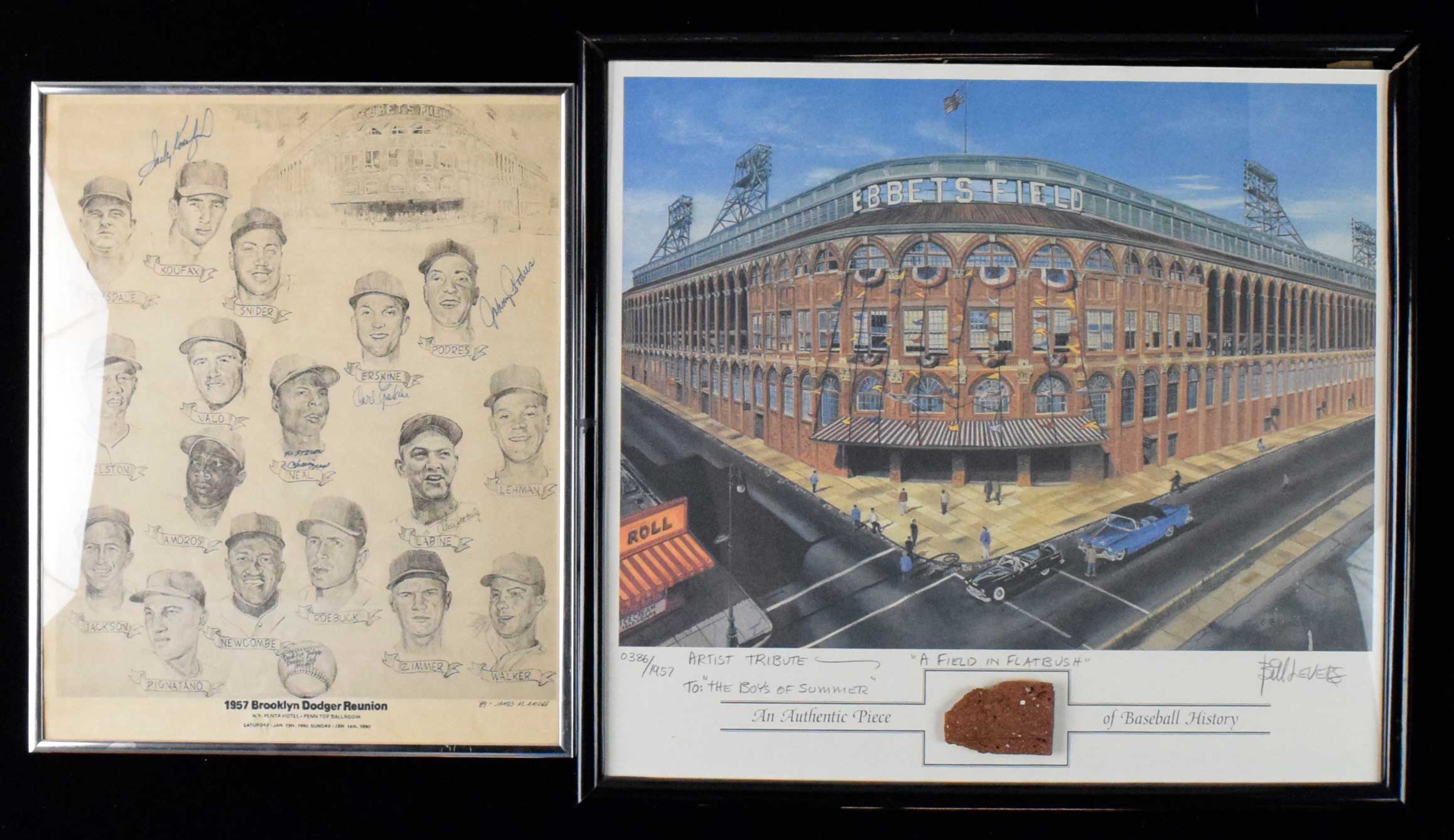Description:(2) Framed Brooklyn Dodgers Lithograph display pieces, including actual Brick from Ebbetts Field & multiple player autographs including Sandy Koufax (NM/MT) Includes 23.5x25.5 framed Signed Lithograph display piece of Ebbets Field #'d 386/1957 which includes an actual piece of brick from the demolition of the former Brooklyn Dodgers' stadium. Also includes 16.5x20.5 framed display piece of 1957 Brooklyn Dodger Reunion (the final Brooklyn Dodger team Ever). Signed by Sandy Koufax, Charlie Neal, Carl Erskine, Clem Labine, and Johnny Podres. Signatures rate 8 to 10 out of 10: NM/MT