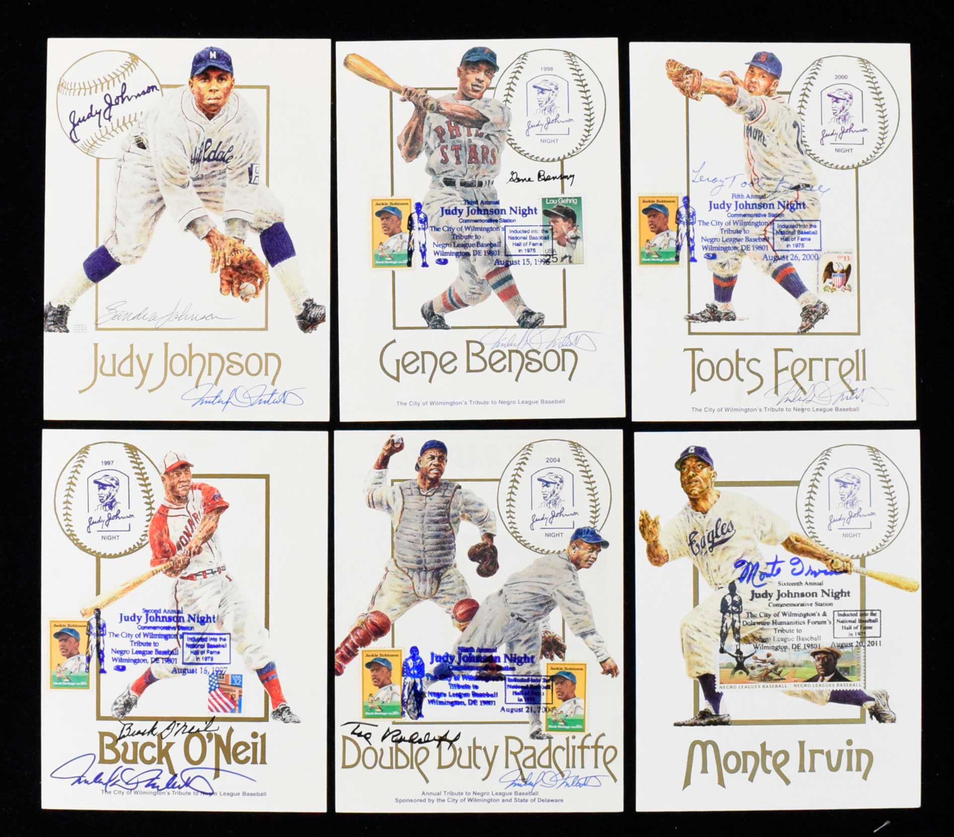 Description:Lot of (16) signed Negro League photo cards (NM overall). Includes Monte Irvin, Buck O'Neil, Ted Radcliffe, Bill (Ready) Cash, Mahlon Duckett, Harold Gould, Stanley Glenn, Mamie "Peanut" Johnson, Gene Benson, Josh Gibson Jr, Toots Ferrell, Mrs. Leon Day, Sharon Robinson, Mrs. Buck Leonard, dual-signed Judy Johnson & niece Sandra Johnson, and one signed only by Sandra Johnson. Signatures rate 7 to 10 (avg 8/9) out of 10: NM overall