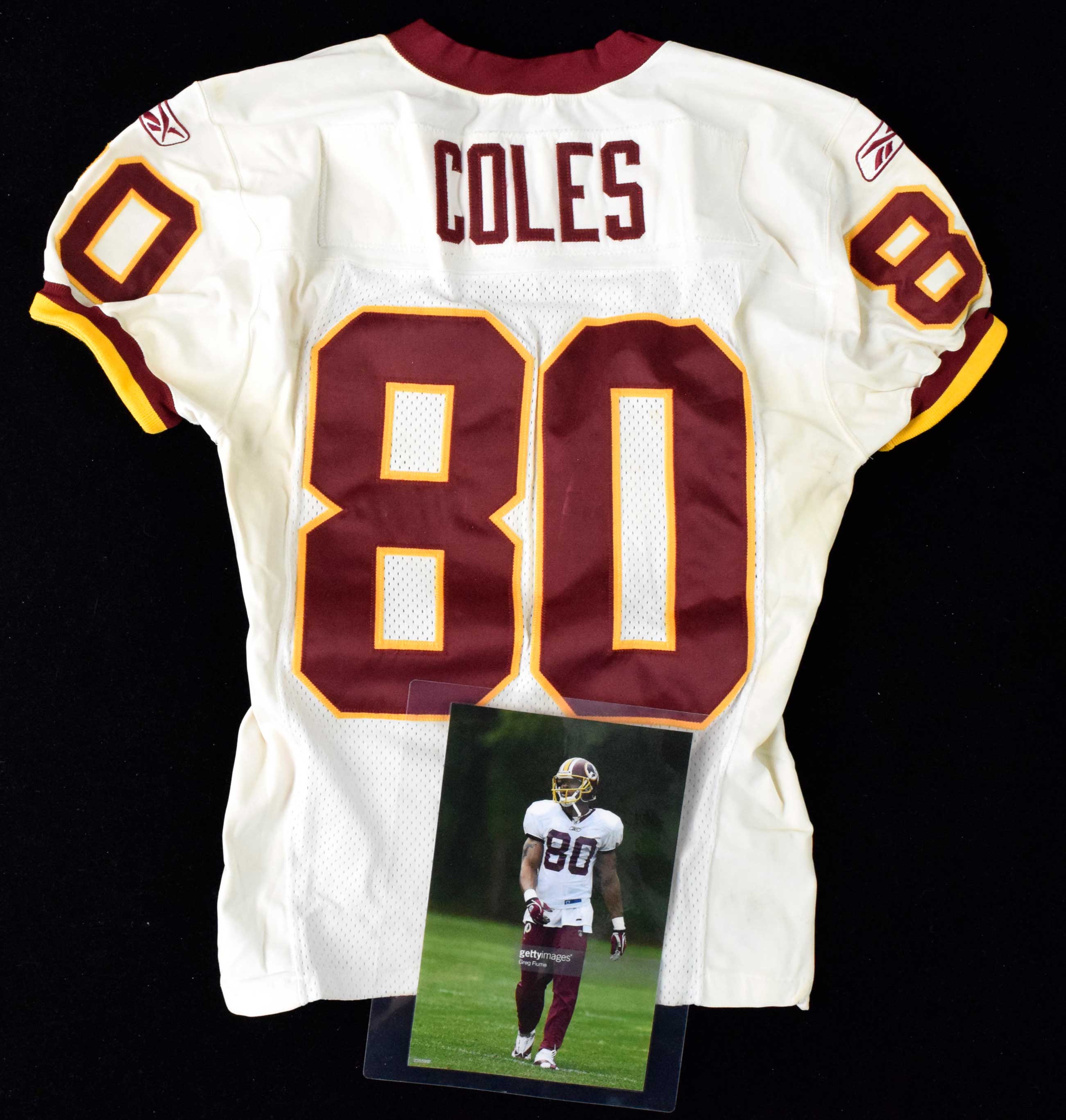 Description:2004 Laveranues Coles professional model Washington Redskins jersey (EX). Reebok size 44 Redskins #80 Laveranues Coles jersey with "04-44" year/size tag sewn inside the collar. Impressive use with staining on the front, back, and shoulders: EX