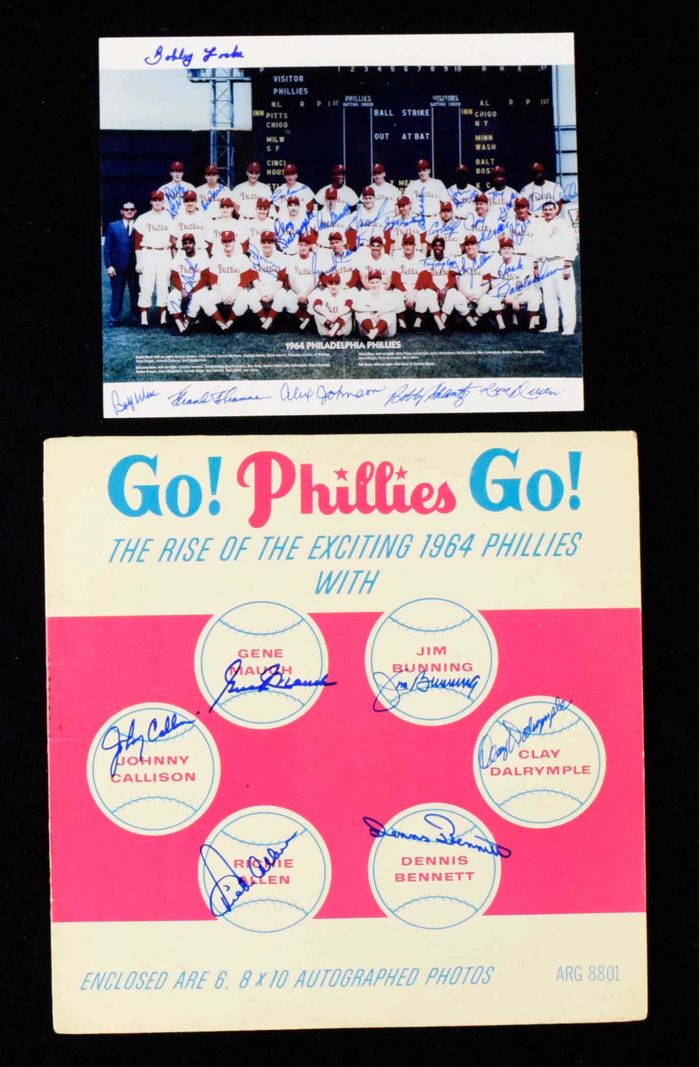 Description:Multisigned Philadelphia Phillies lot (EX/NM) Includes a 8x10 1964 team photo signed by 28 Phillies and a "Go Phillies Go" record signed on the front cover by Johnny Callison, Gene Mauch, Jim Bunning, Clay Dalrymple, Richie Allen, Dennis Bennett. Signatures rate 8 to 10 out of 10. Both are in good shape and present well: EX/NM