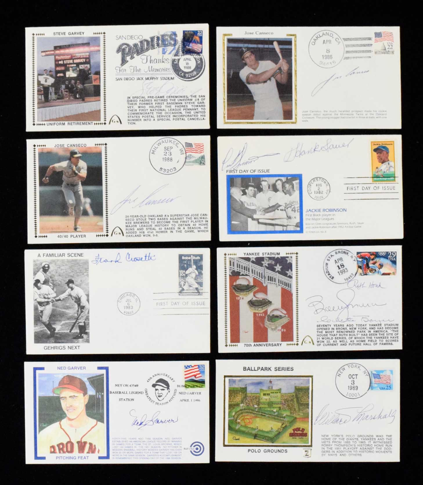Description:Lot of (20) signed cachets and (21) unsigned cachets (EX-NM/MT) Signed cachets include Carlos Baerga, Dom Damaggio, Mel Harder, Jim Eisenreich, Allie Clark, Joe Garagiola, Ken Keltner & Lou Boudreau, Bobby Thompson, Vida Blue, Harry Walker, Cookie Lavagetto, Bobby Richardson, Willard Marshall, Ned Garver, Ralph Hauch & Bobby Murcer & Clete Boyer, Frank Crosetti, Curt Simmons & Hank Sauer, (2) Jose Canseco, and Steve Garvey. (21) unsigned consist of movie and other entertainment stars. EX-NM/MT