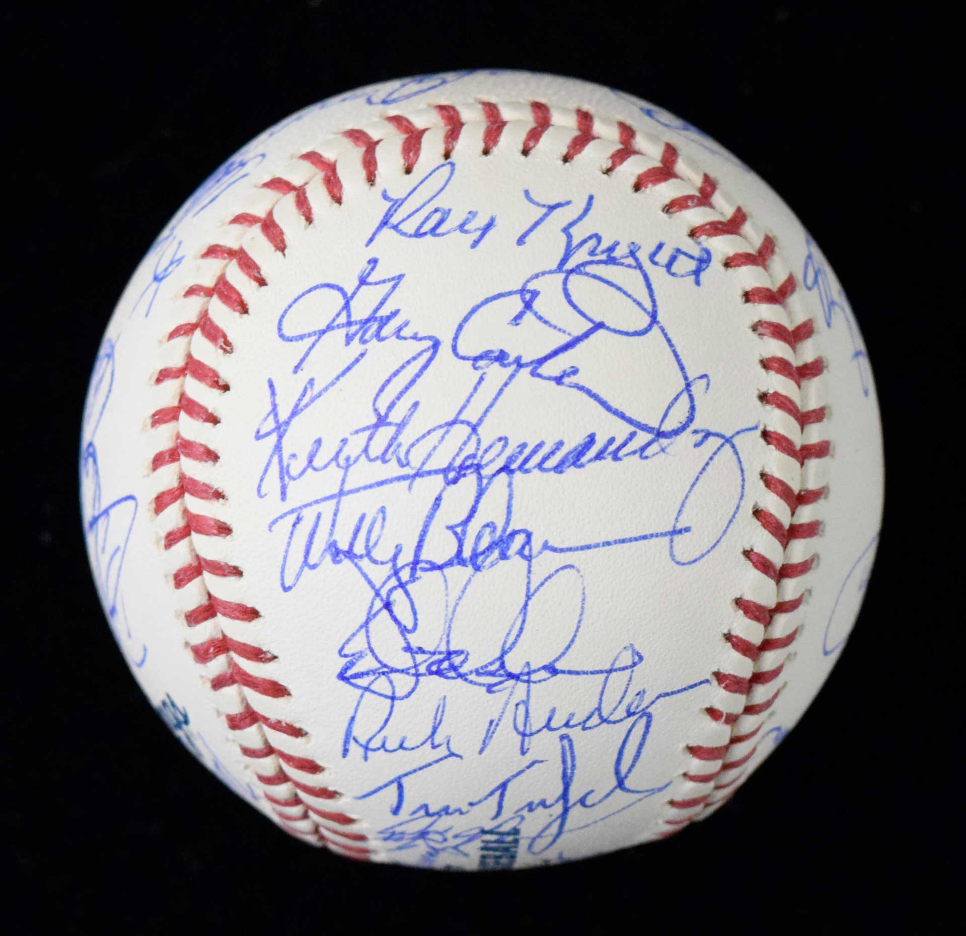 Description:1986 New York Mets reunion team signed baseball - JSA (NM). B.Selig ML ball signed by (33) members of the 1986 World Series champion Mets including Davey Johnson, Gary Carter, Keith Hernandez, Dwight Gooden, Darryl Strawberry, Lenny Dykstra, Ron Darling, Kevin Mitchell, Ray Knight, Wally Backman, Mookie Wilson, Sid Fernandez, Jesse Orosco, and others. Signatures rate 7/8 to 9/10 out of 10. Includes full LOA from JSA: NM