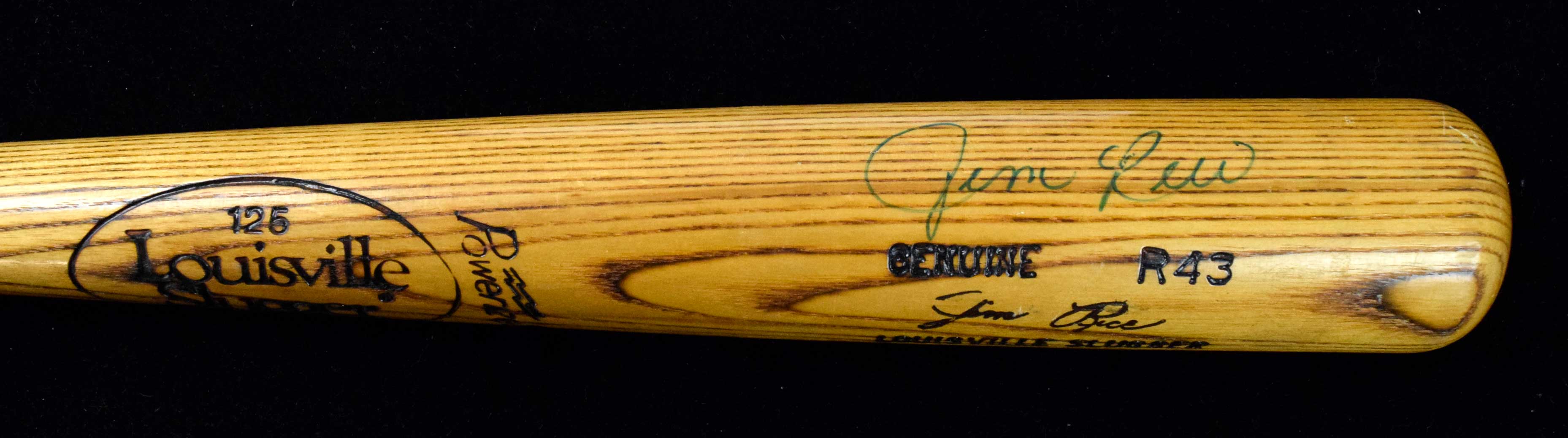 Description:Jim Rice signed professional model baseball bat, c.1985 (NM unused). 34" Louisville Slugger R43 Jim Rice model bat signed by Rice in blue marker. Signature rates 8 out of 10. Unused, with only minor surface wear: NM