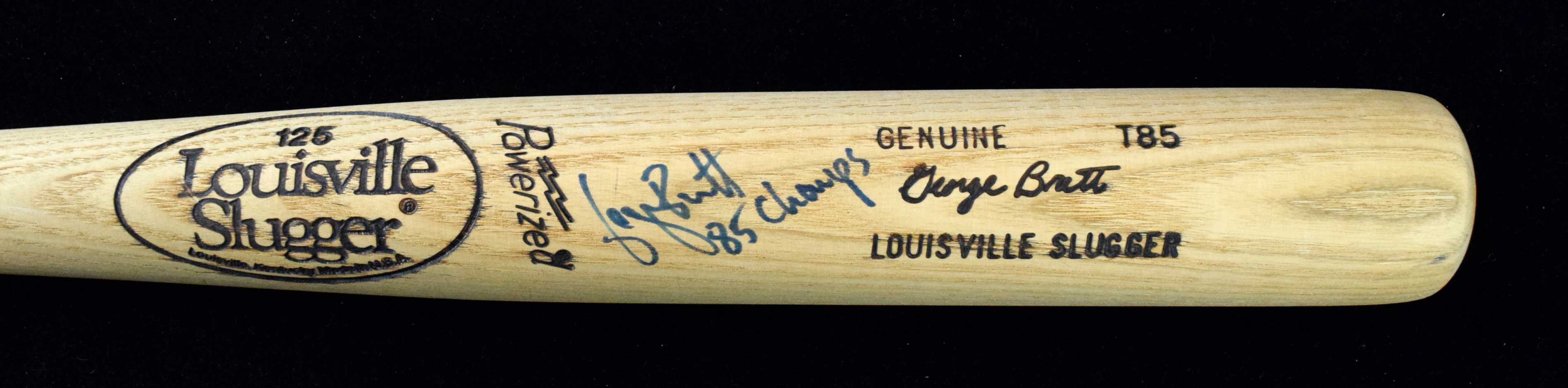 Description:George Brett signed and inscribed pro stock baseball bat, c.1983-85 (NM). c.1983-85 34.5" Louisville Slugger T85 George Brett pro stock bat signed by Brett in blue marker with "85 Champs" inscription. Signature rates 8/9 out of 10: NM