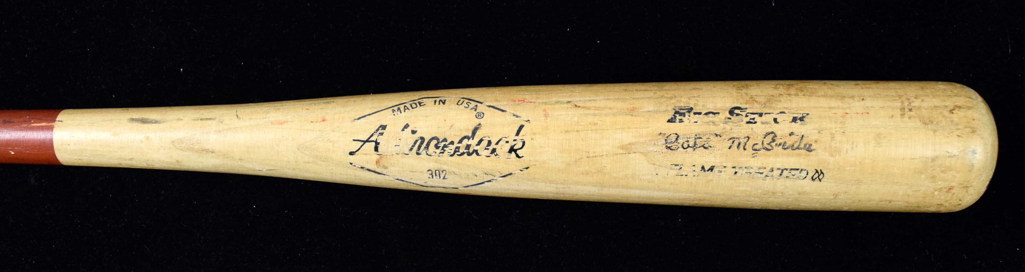 Description:Bake McBride professional model baseball bat, c.1973-79 (EX). 33" Adirondack 256S Bake McBride model bat with his #21 still lightly visible on the knob in black marker. Impressive use with numerous ball marks and rack marks: EX