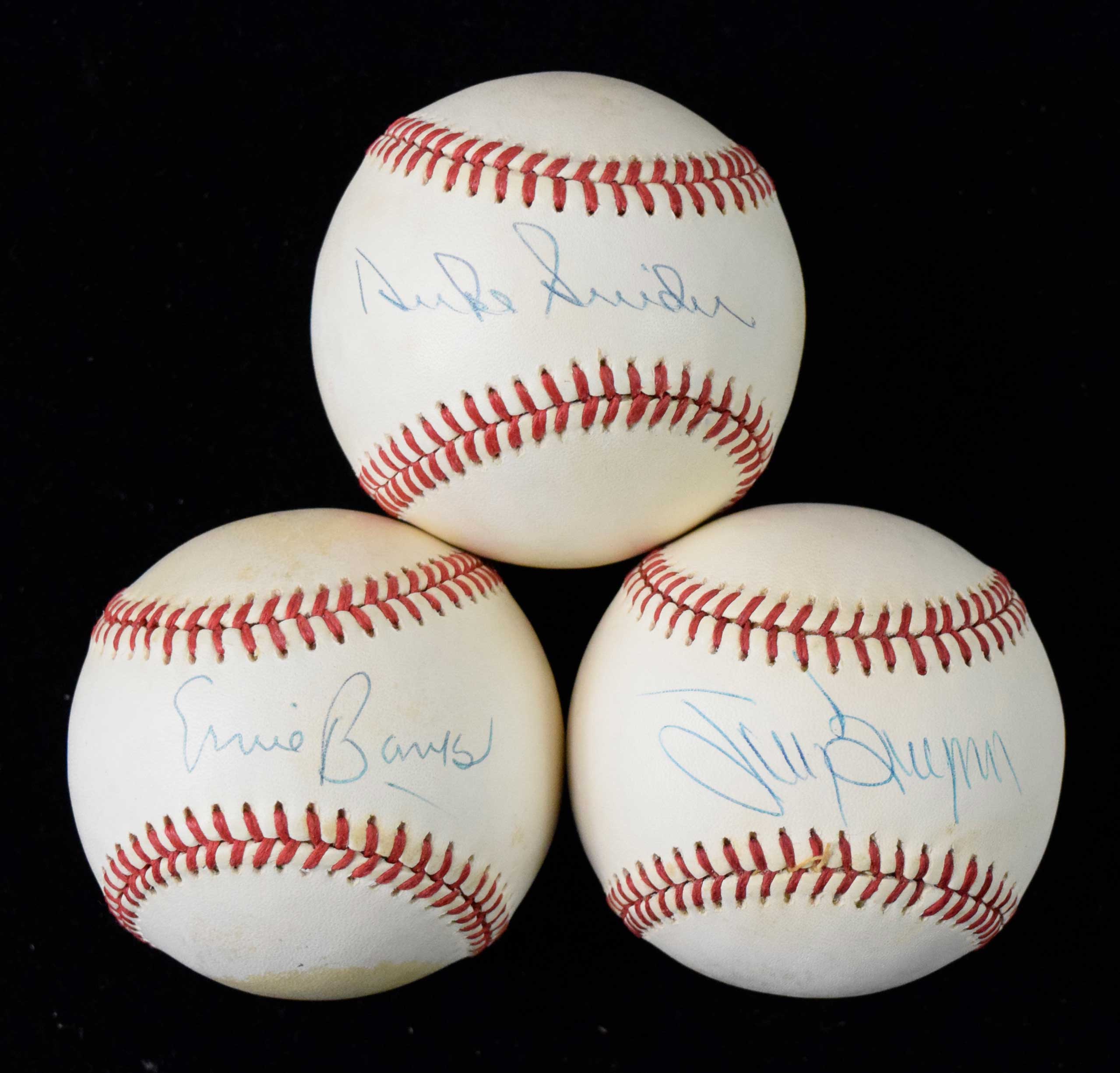 Description:Tony Gwynn, Duke Snider, and Ernie Banks signed baseballs (EX-EX/MT). All are signed in blue ink on the sweet spot of B.Giamatti NL balls. Signatures rate 8/9 to 9/10 out of 10. Each ball has areas of light to moderate toning: EX-EX/MT