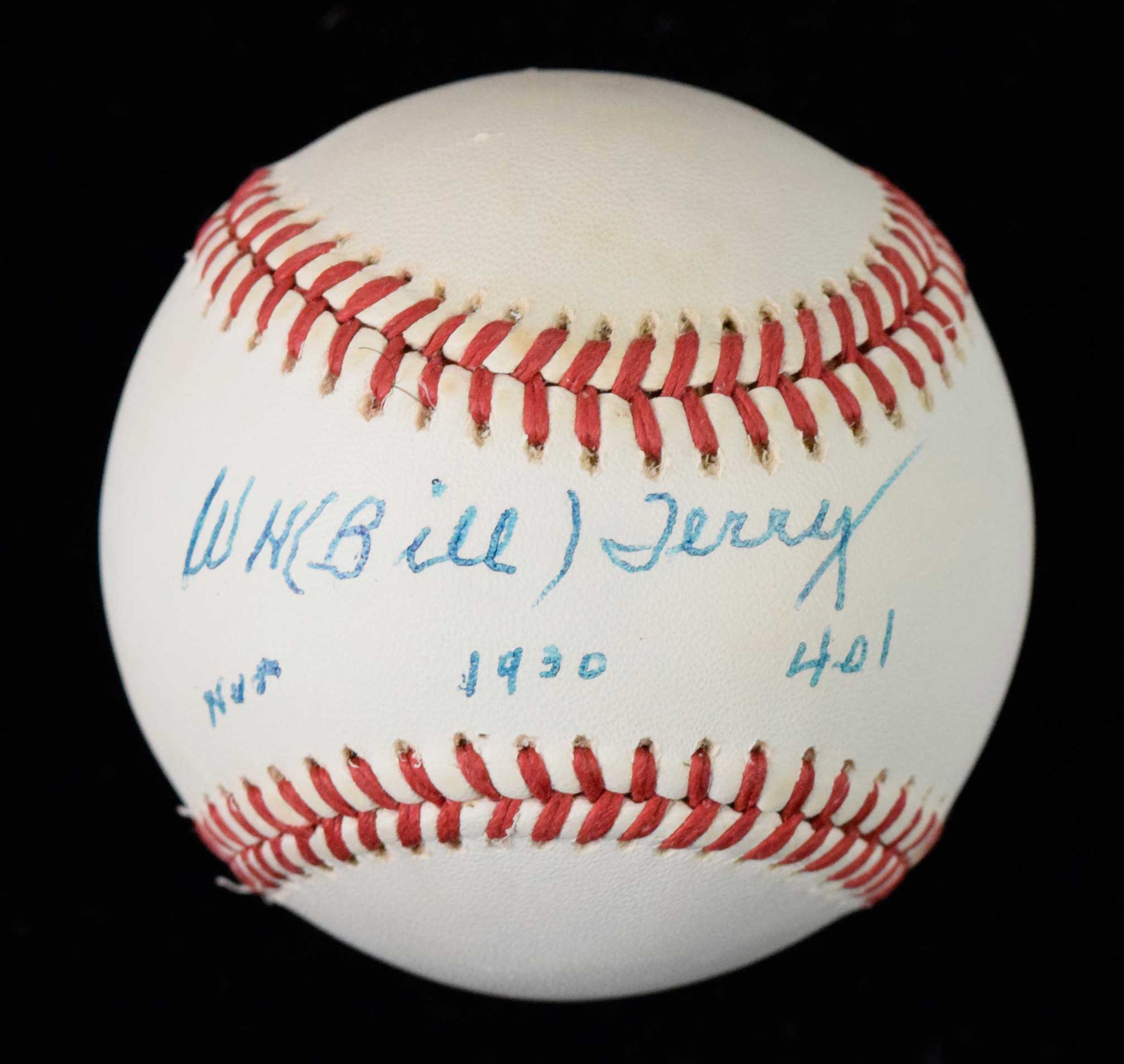 Description:Bill Terry signed and inscribed B.Giamatti NL baseball (NM). Terry signed the sweet spot in blue ink and added "HOF" "1930 .401" inscriptions. Signature rates 8 out of 10: NM