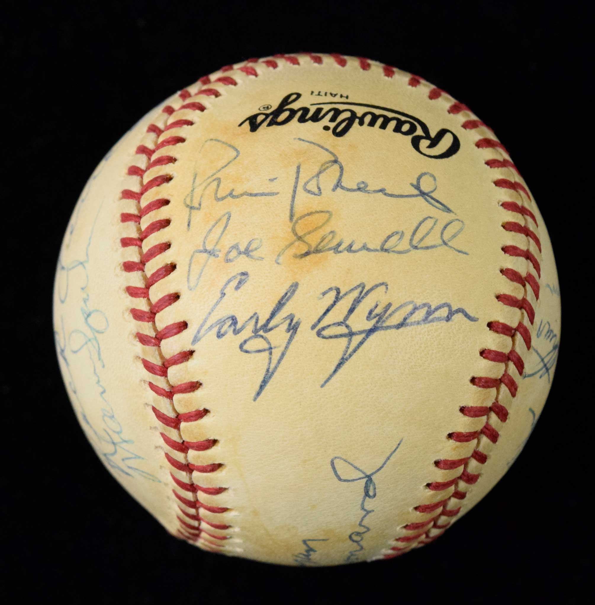 Description:Deceased HOFers multi-signed baseball (EX). C.Feeney NL ball signed by (13) including Johnny Mize, Enos Slaughter, Billy Herman, Buck Leonard, Robin Roberts, Joe Sewell, Early Wynn, Hoyt Wilhelm, Eddie Mathews, Monte Irvin, Duke Snider, Rick Ferrell, and Warren Spahn. Signatures rate 6/7 to 9/10 (avg 7/8) out of 10. Toning on all panels: EX