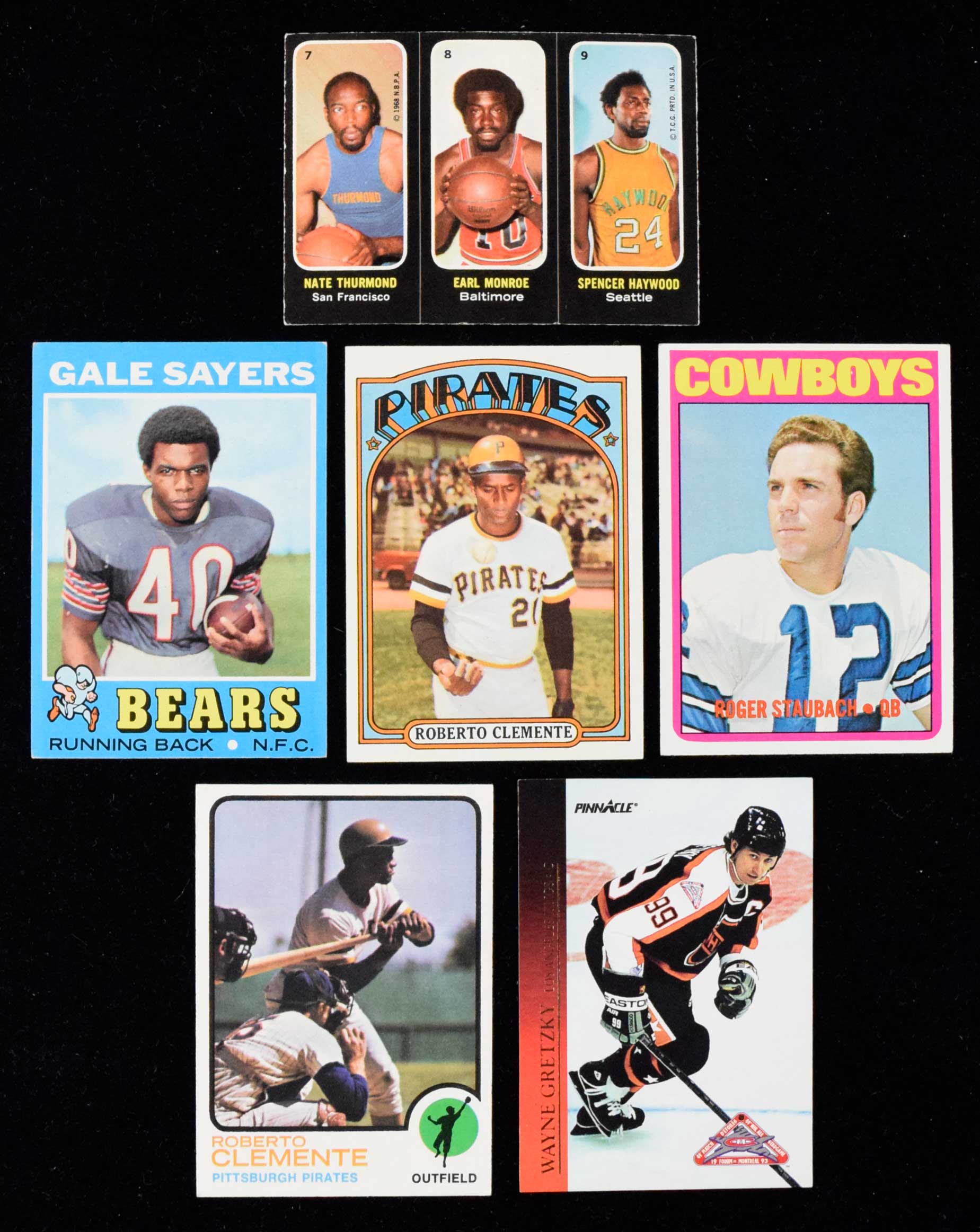 Mixed sports card lot from 1971-1994 including Staubach rookie & other HOFers (VG-NM/MT). Includes 1971 Topps #s 25 Duck Butkus, 71 Alan Page, 150 Gale Sayers, 160 Bob Griese, and 260 O.J. Simpson (VG-VG/EX); 1971-72 Topps "Trios Stickers" #7-8-9 Nate Thurmond / Earl Monroe / Spencer Haywood (VG/EX); 1972 Topps Baseball #s 221, 228, 226, (2) 309 Roberto Clemente, and 310 Clemente (VG-NM, avg EX/MT); 1972 Topps #200 Roger Staubach (VG/EX); 1973 Topps #50 Clemente (VG/EX); 1993-94 Score Hockey set; and 1993-94 Score "Pinnacle All-Stars" insert set: VG-NM/MT