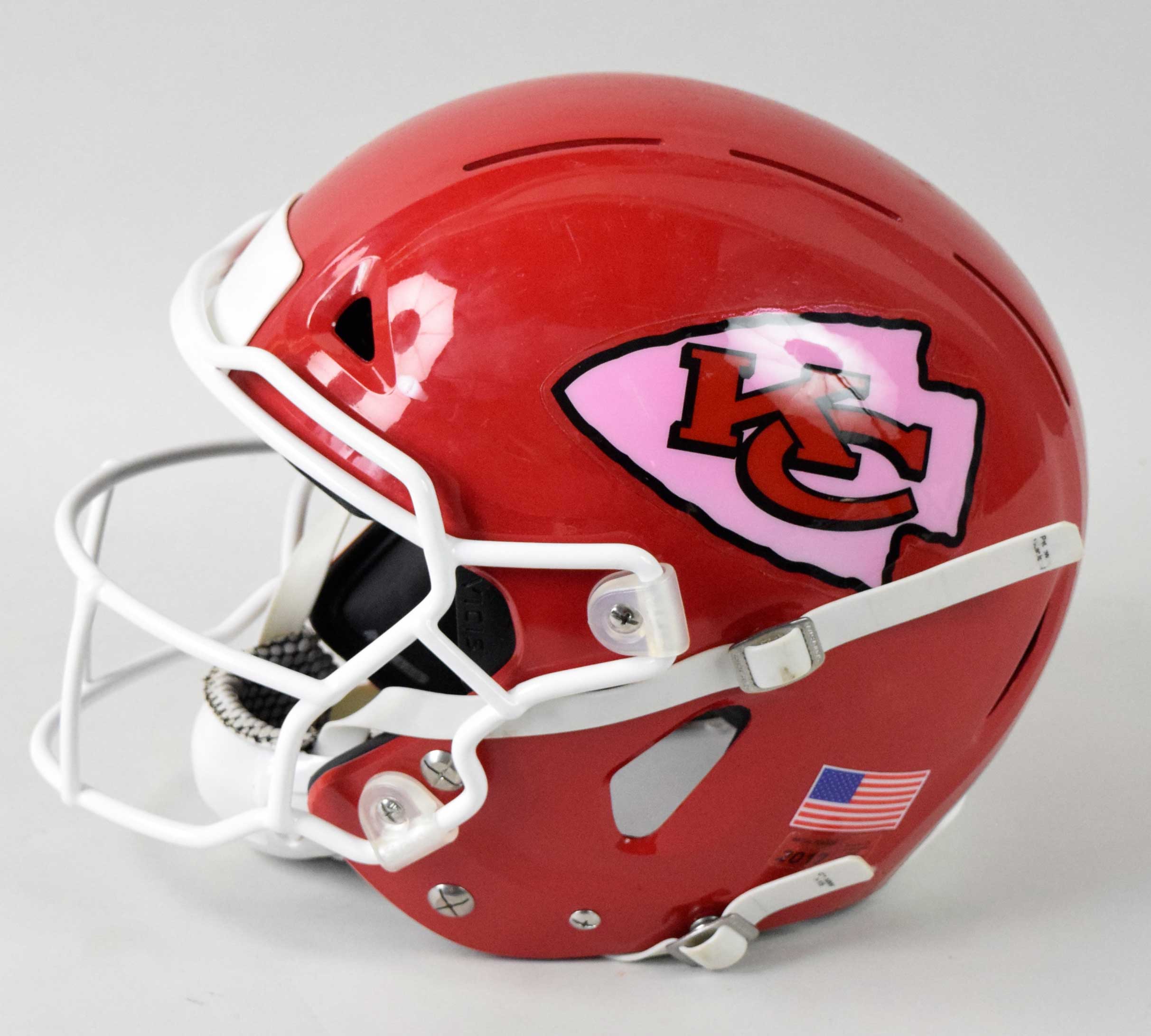 Description:Patrick Mahomes style Kansas City Chiefs VICIS professional quality helmet (NM). Made in a similar style to the helmet worn by Mahomes. August 2017 production sticker is inside, and American flag decal is behind the left ear hole. Unused, with minor surface wear: NM overall