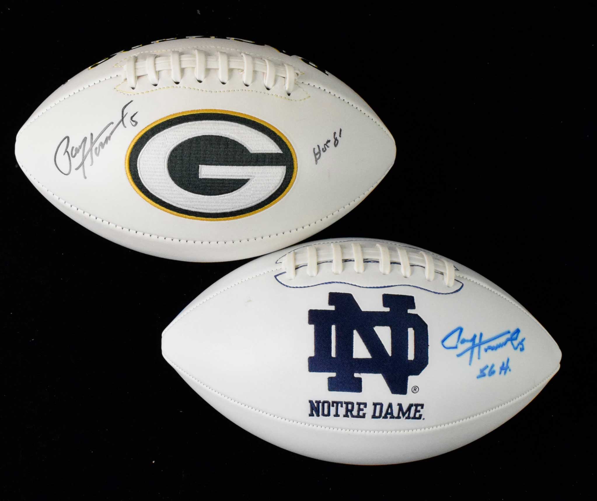Description:Paul Hornung signed Green Bay Packers and Notre Dame logo footballs (EX/MT-NM). Includes full size Packers football signed by Hornung in black marker, and full size Notre Dame football signed by Hornung in blue marker. Signatures rate 8 to 8/9 out of 10. Minor scuff marks on the white surface. Includes letter of provenance from Angela Hornung: EX/MT-NM