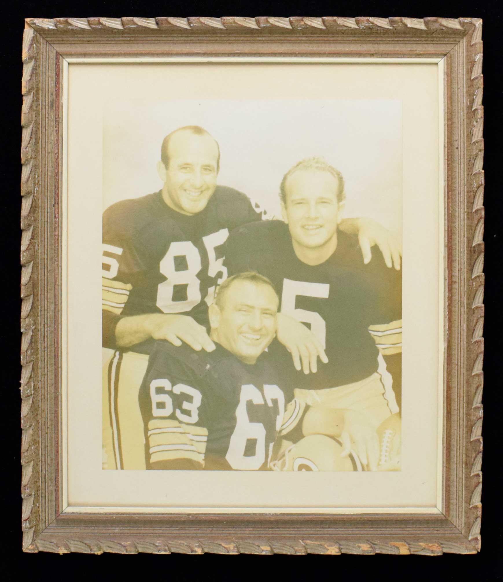Description:Paul Hornung, Max McGee, Fuzzy Thurston vintage oversize framed photo from the Hornung collection (EX/MT). Frame measures approx. 24.5"x28.5". All three are posed together smiling in their Green Bay Packers uniforms. Due to framing, complete condition is unknown. Minimal wear visible, but appears faded. Includes letter of provenance from Angela Hornung: EX/MT overall appearance
