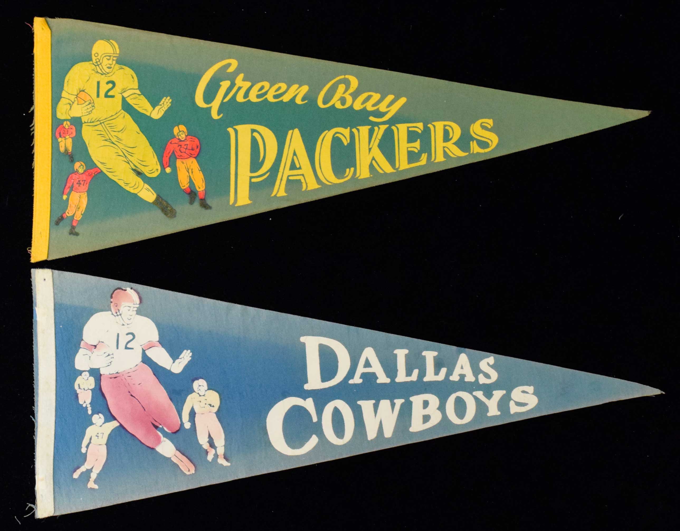 Description:Green Bay Packers and Dallas Cowboys vintage pennants, c.early 1960s (VG/EX-EX). Both are full size, with clipped tassels. Small tack holes, and some discoloration at the edges. Fairly minor wear otherwise: VG/EX-EX