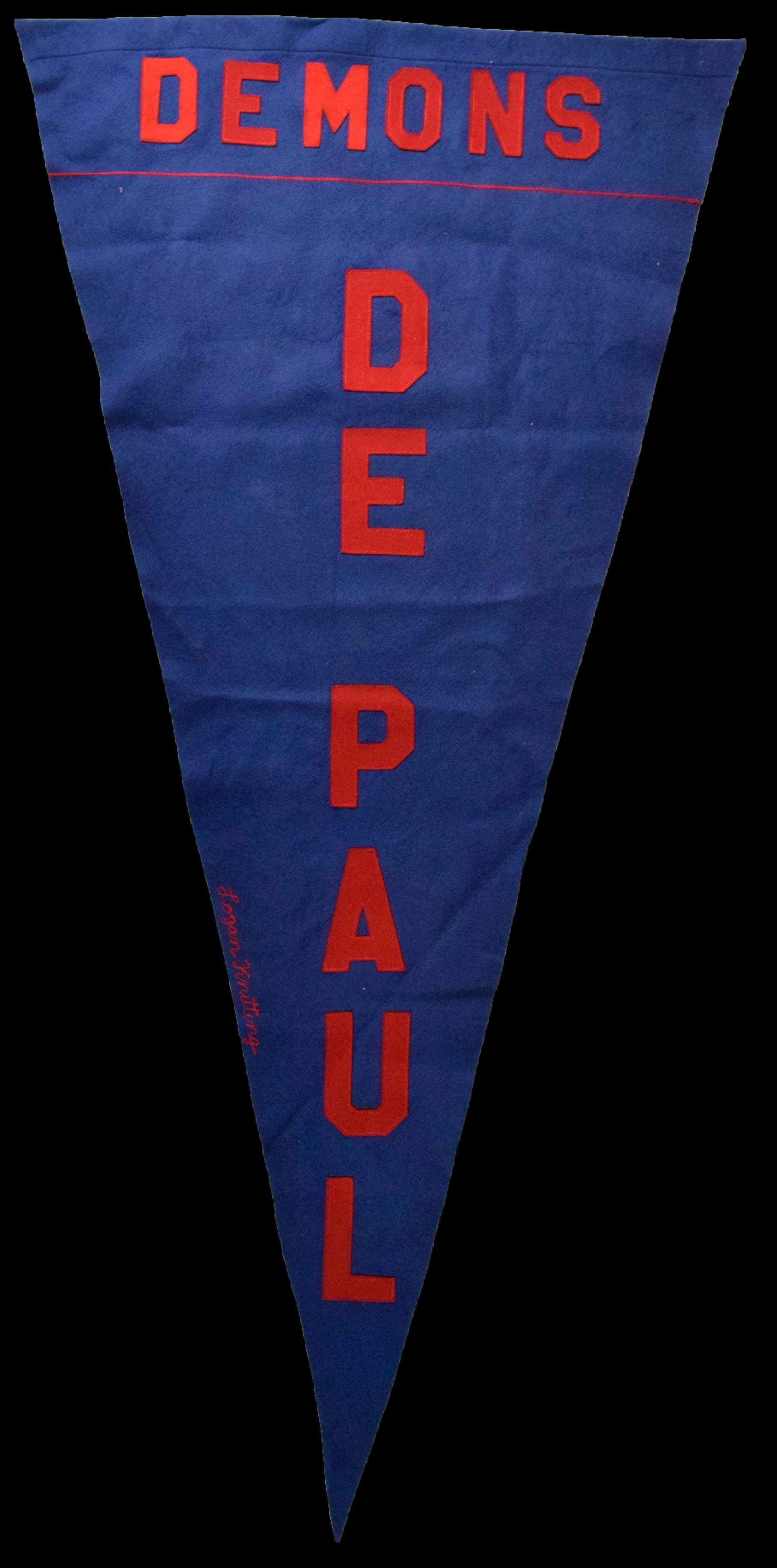 High grade vintage DePaul Demons banner, c.1960s (NM). 71" long pennant style banner with Logan Knitting chain stitched on the edge. Minimal wear: NM