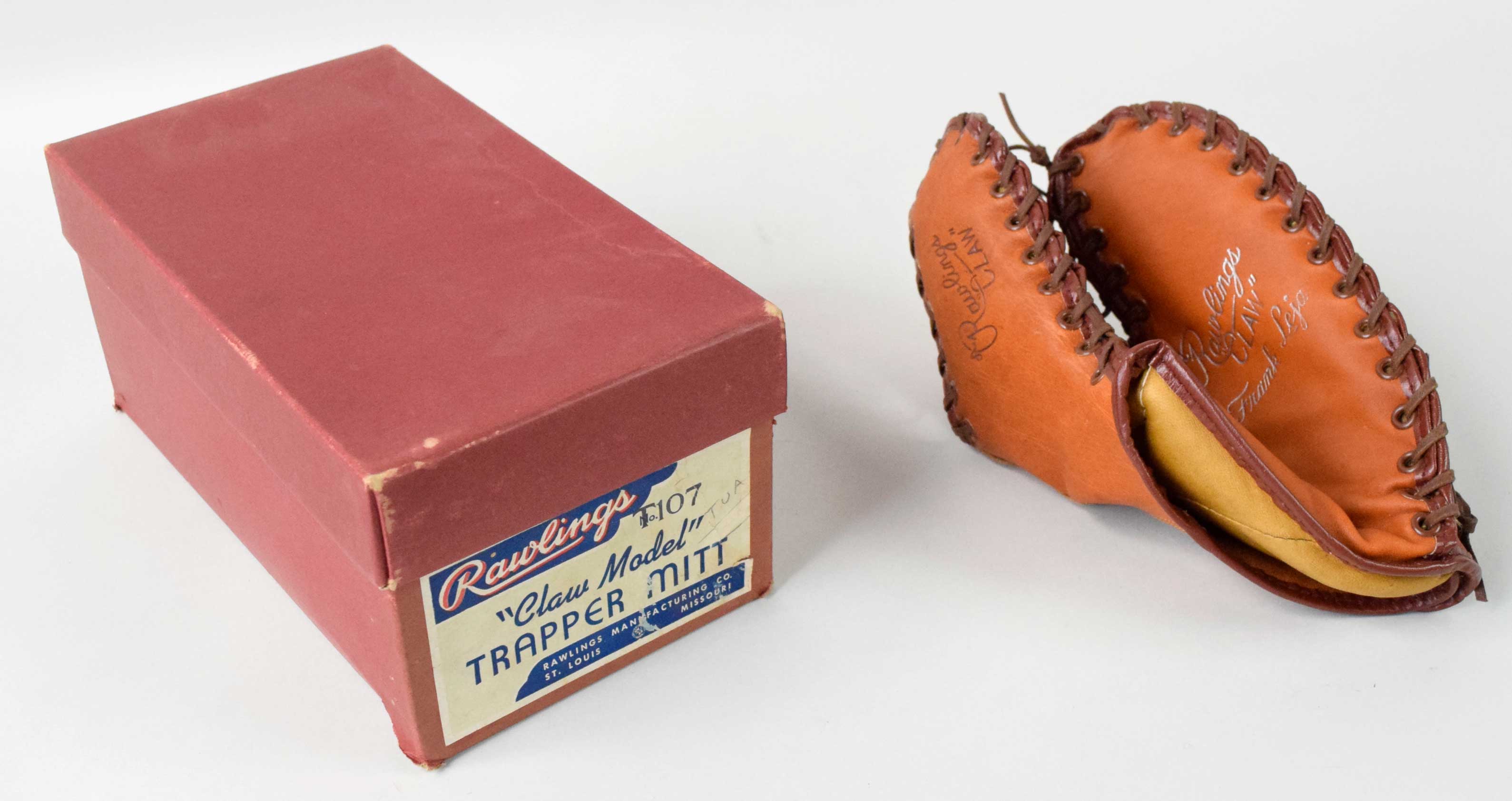Description:Frank Leja store model 1st base mitt with original box, c.1950s (glove NM, box EX). Rawlings T107 Frank Leja model 1st base mitt for right handed thrower (NM unused), with original box (EX handling/storage wear).