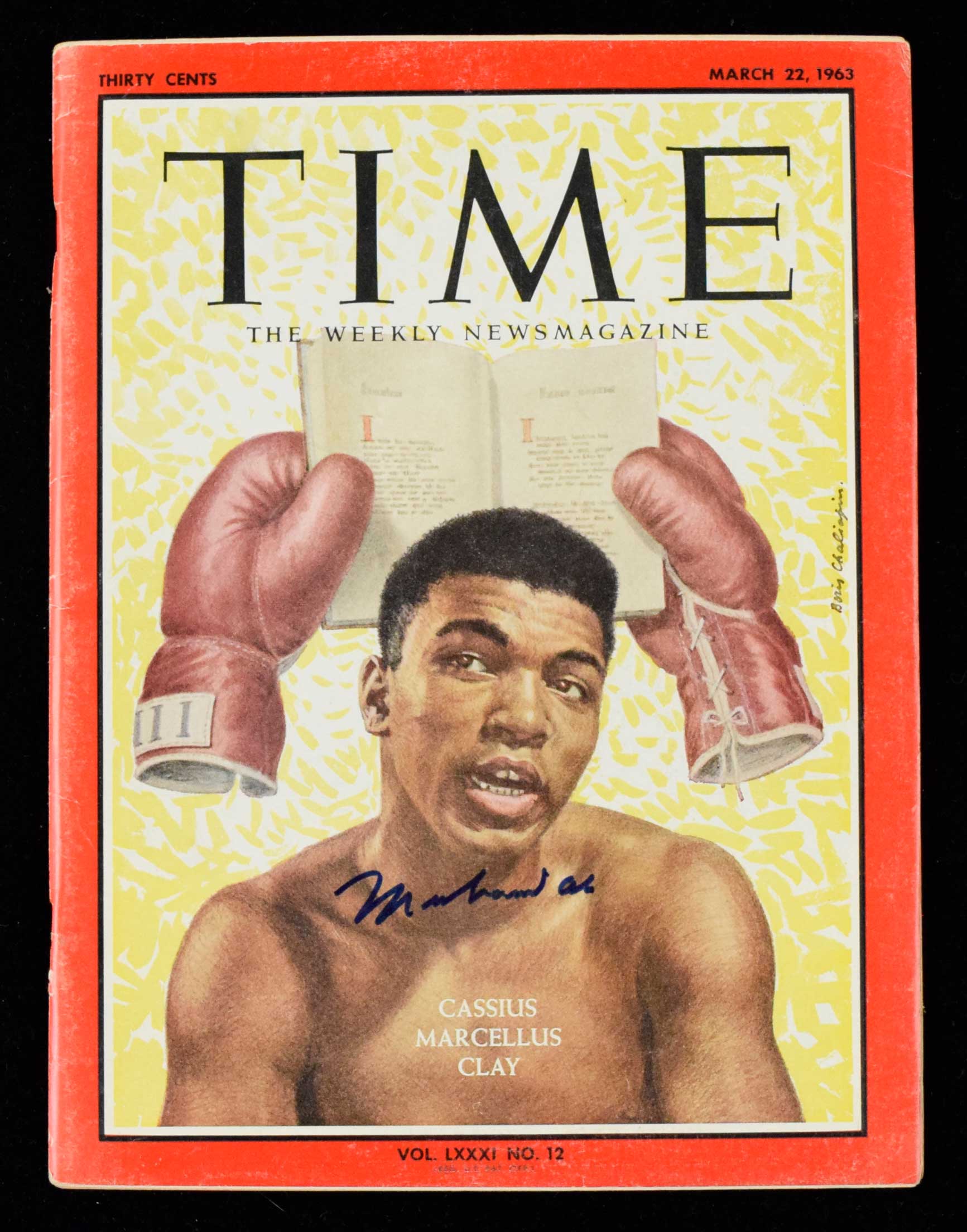 Description:Muhammad Ali autographed 1963 TIME Magazine (Sig. NM, Magazine EX/MT) Signed in marker rating 9/10 out of 10. Touch of light wear: Sig. NM, Magazine EX/MT ($500-$1,000)