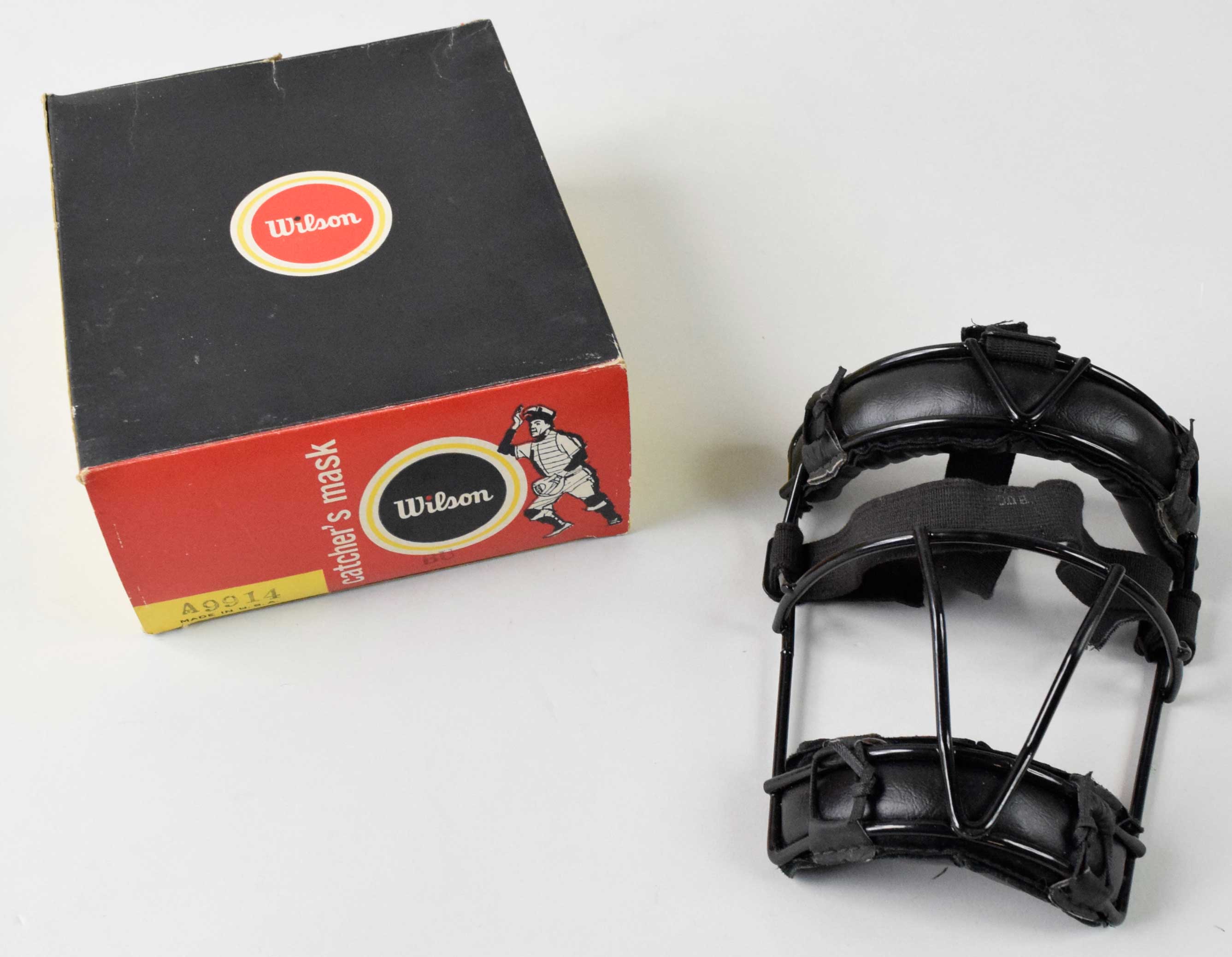 Description:Wilson umpire's mask with original box, c.1960s (mask NM, box VG/EX). Wilson A9914 model umpire's mask remains in unused condition (NM). Includes original catcher's mask box stamped "BU" likely for Baseball Umpire (VG/EX tape repair to tear on the bottom of the box).