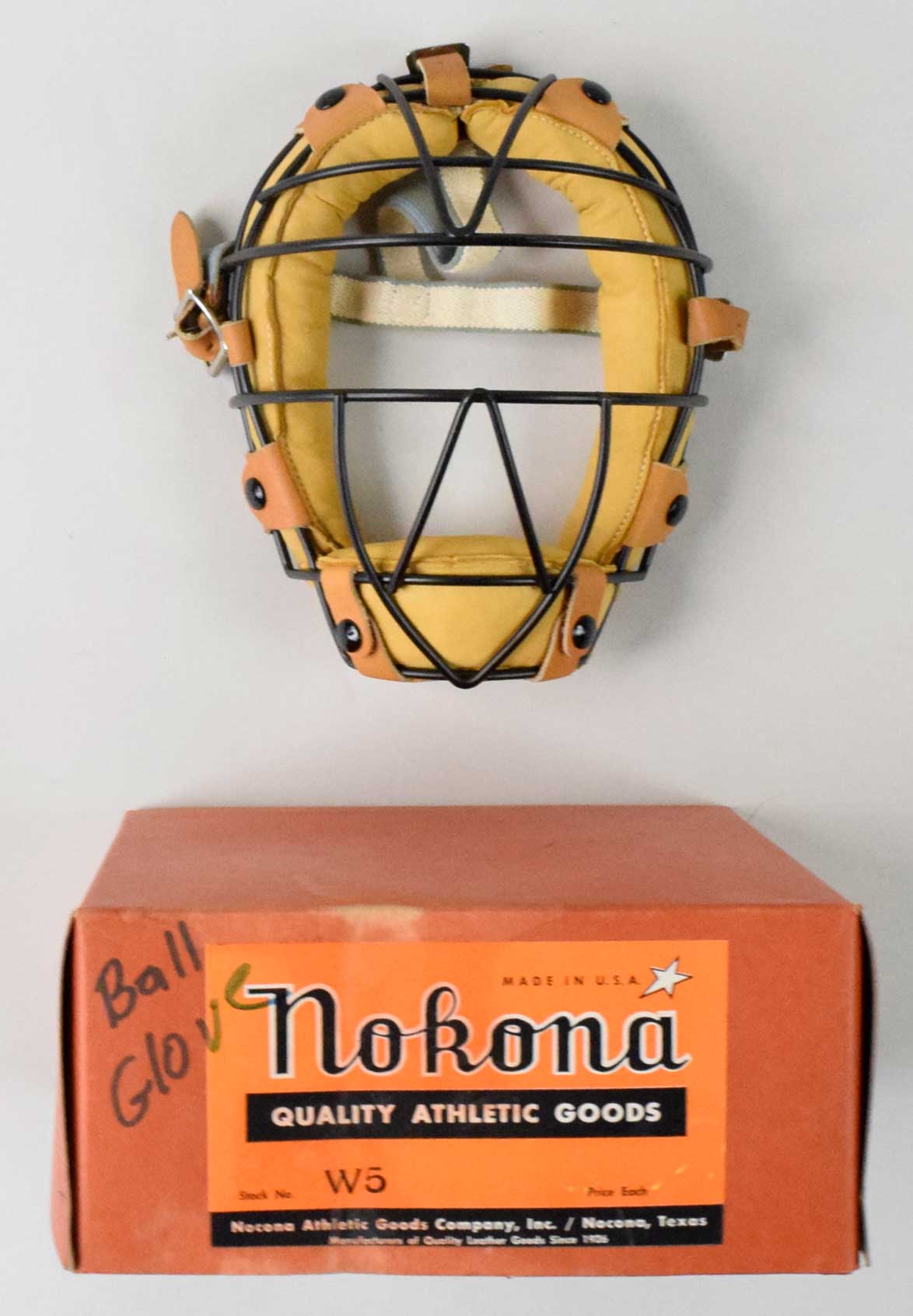 Description:Nokona catcher's mask with original box, c.1950s-60s (mask NM, box EX). Nokona W5 model catcher's mask remains in unused condition (NM). Includes original box with W5 model number (EX moisture staining, "ball glove" has been written on the box).