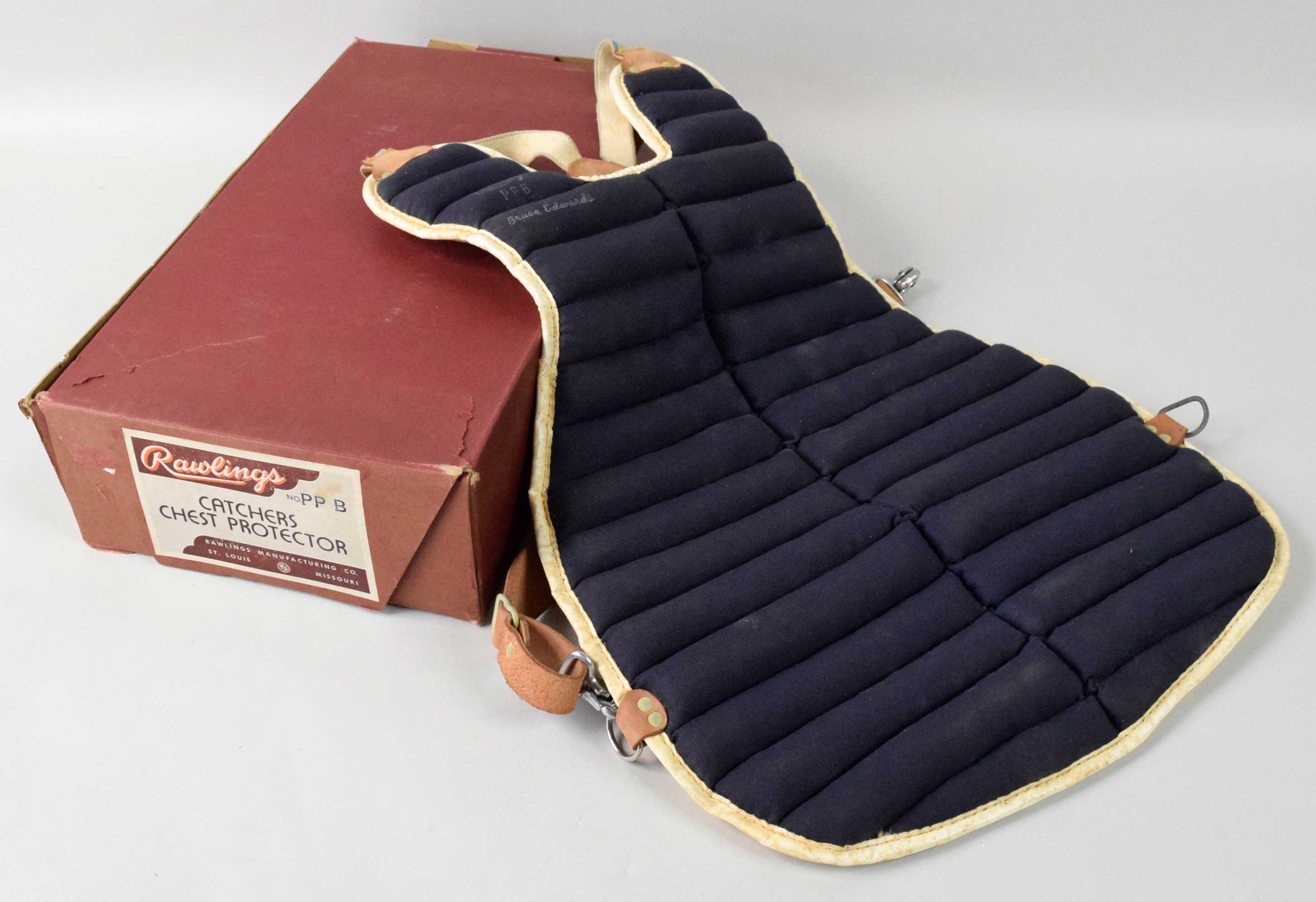 Description:Bruce Edwards store model chest protector with original box, c.1940s-50s (NM, box VG/EX). Rawlings PPB Bruce Edwards endorsed chest protector remains in unused condition (NM). Includes original box which has a tear at the edge of one side (VG/EX).